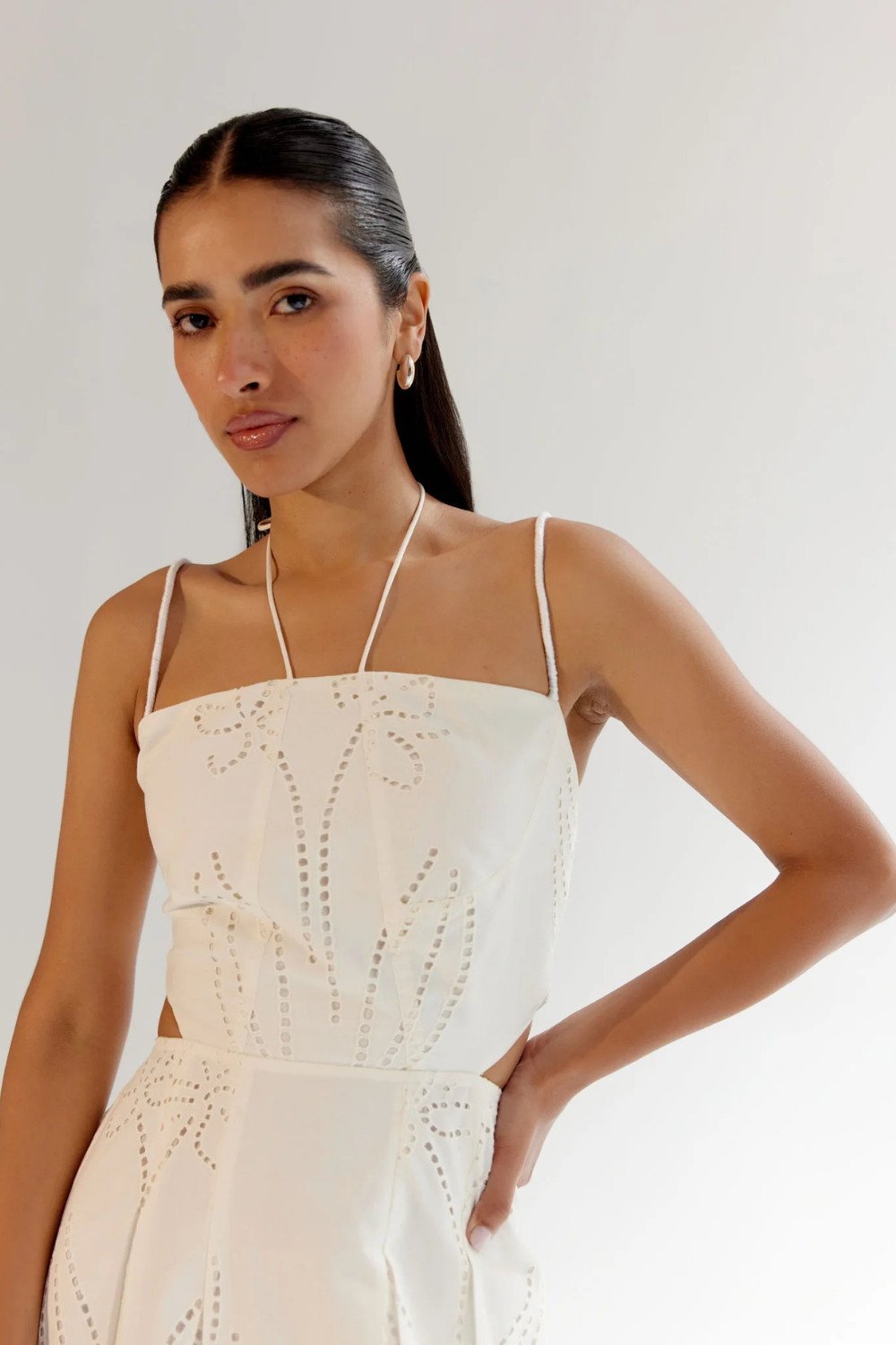 Introducing the Ariel Midi that comes in two elegant variations: By the Sea, a placement print on breathable linen lyocell, and a classic Schiffli Embroidery on premium giza poplin. Both designs feature straps adorned with intricate anchor threads wrapped around the strap detailing, adding a unique nautical-inspired touch.