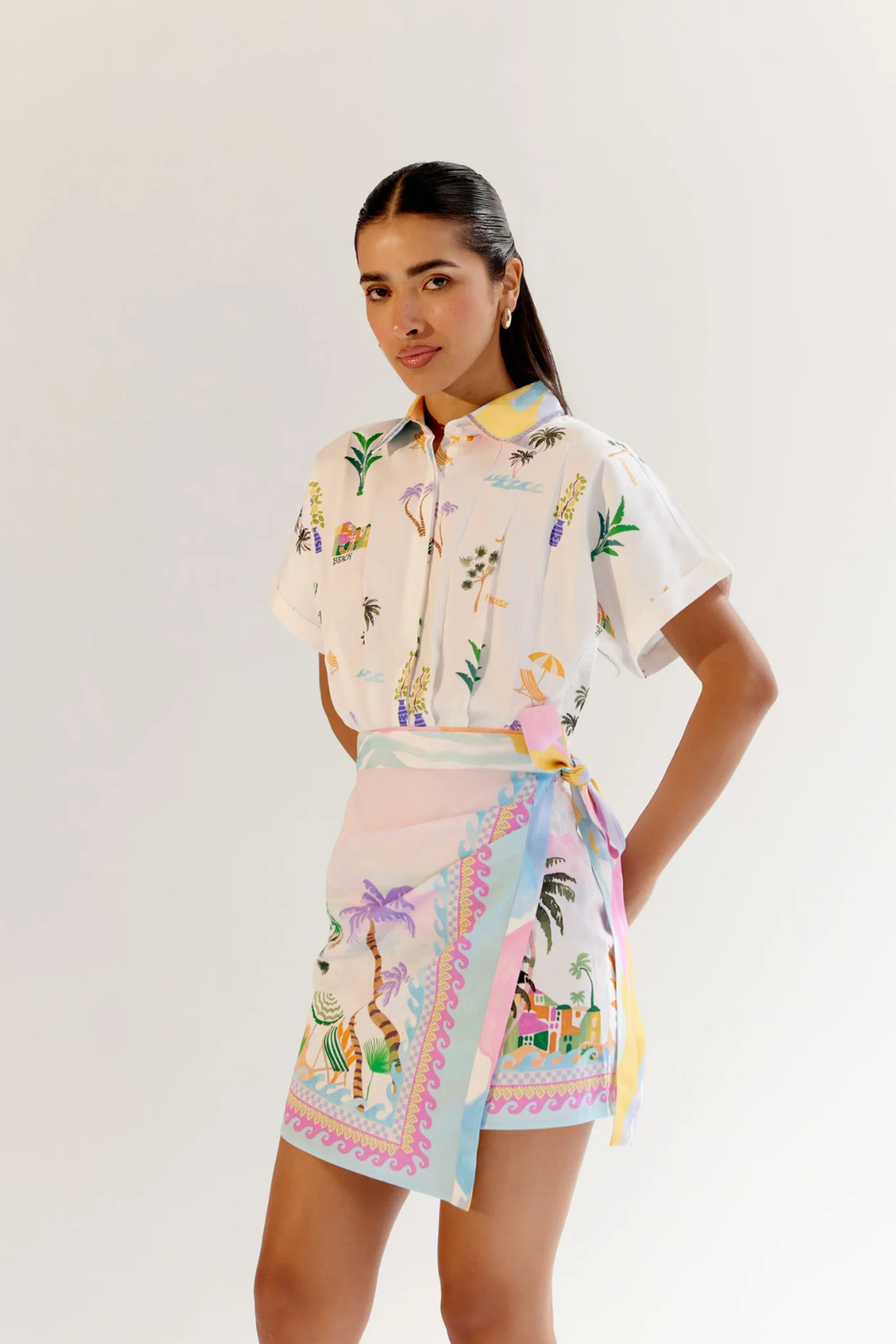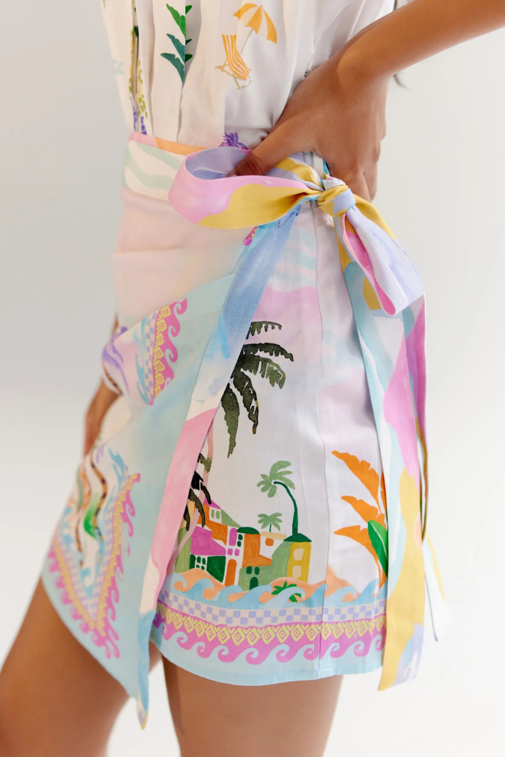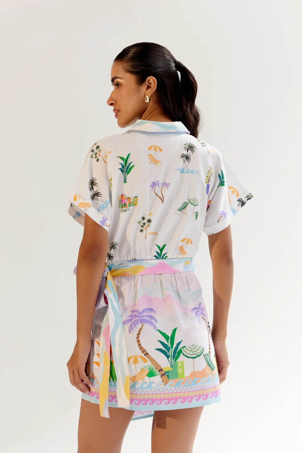 Introducing the Kate Mini featuring a tie belt at the waist, accentuated with an elasticated back for a custom, comfortable fit. Embroidery detailing on the collar adds an elegant touch, while the placement prints—By the Sea and Postcard—evoke serene moments of collecting seashells by the shore or reminiscing through treasured memories.