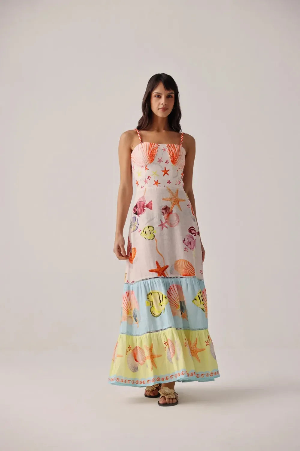 Fine-strap sleeveless maxi dress silhouette with a two-tiered fall