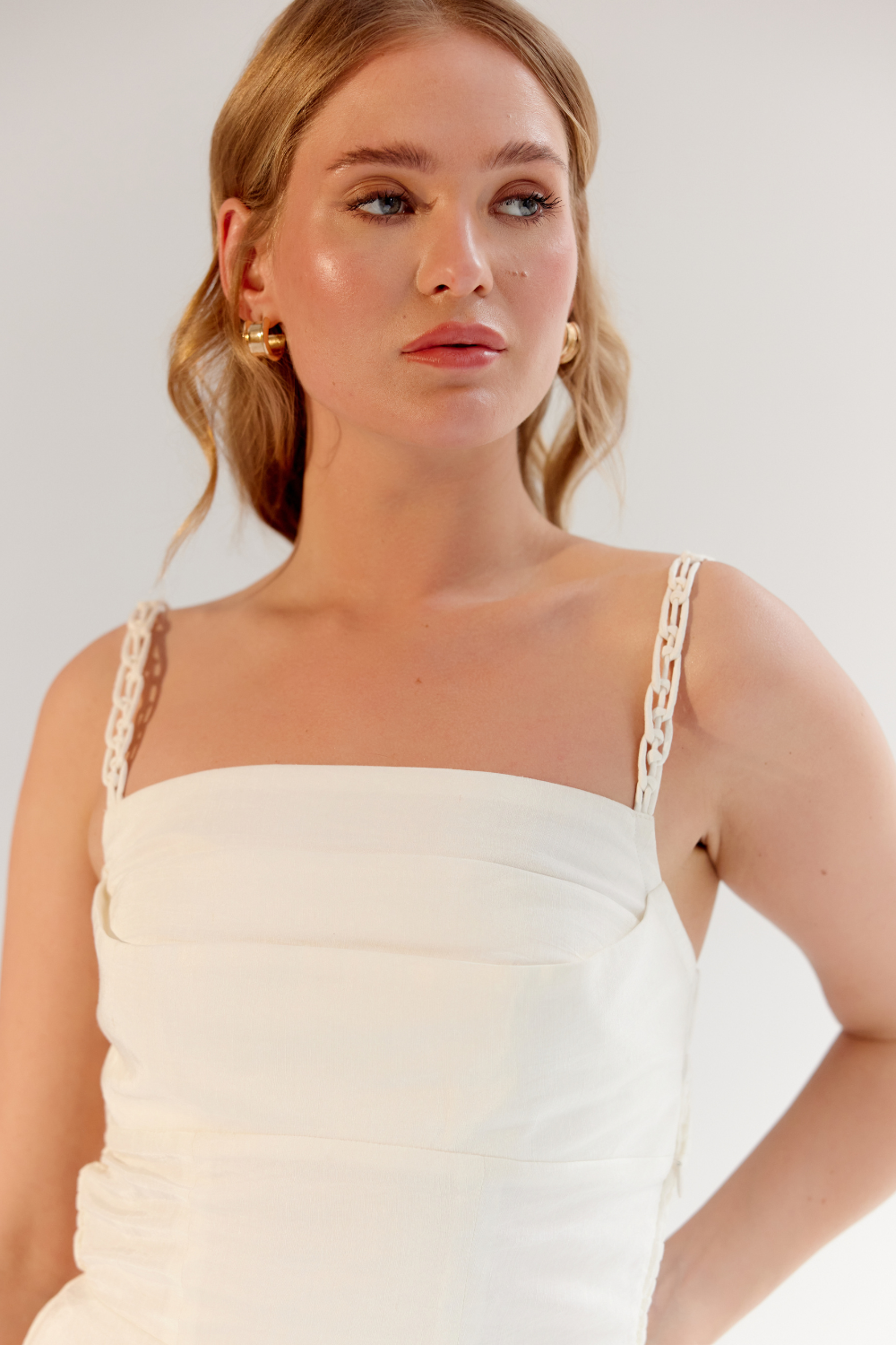Introducing the Valentina Midi that is available in three stunning variations: Seashell and Forest, both featuring exquisite placement prints on soft viscose linen, and a timeless Schiffli Embroidery option on the same breathable fabric. Each design showcases intricate hand-pleated detailing on the bust, a cinched waist for a flattering silhouette, and a subtle flare below the waist for effortless movement. The interlocked chain strap detailing adds a sophisticated and modern touch to this graceful piece.