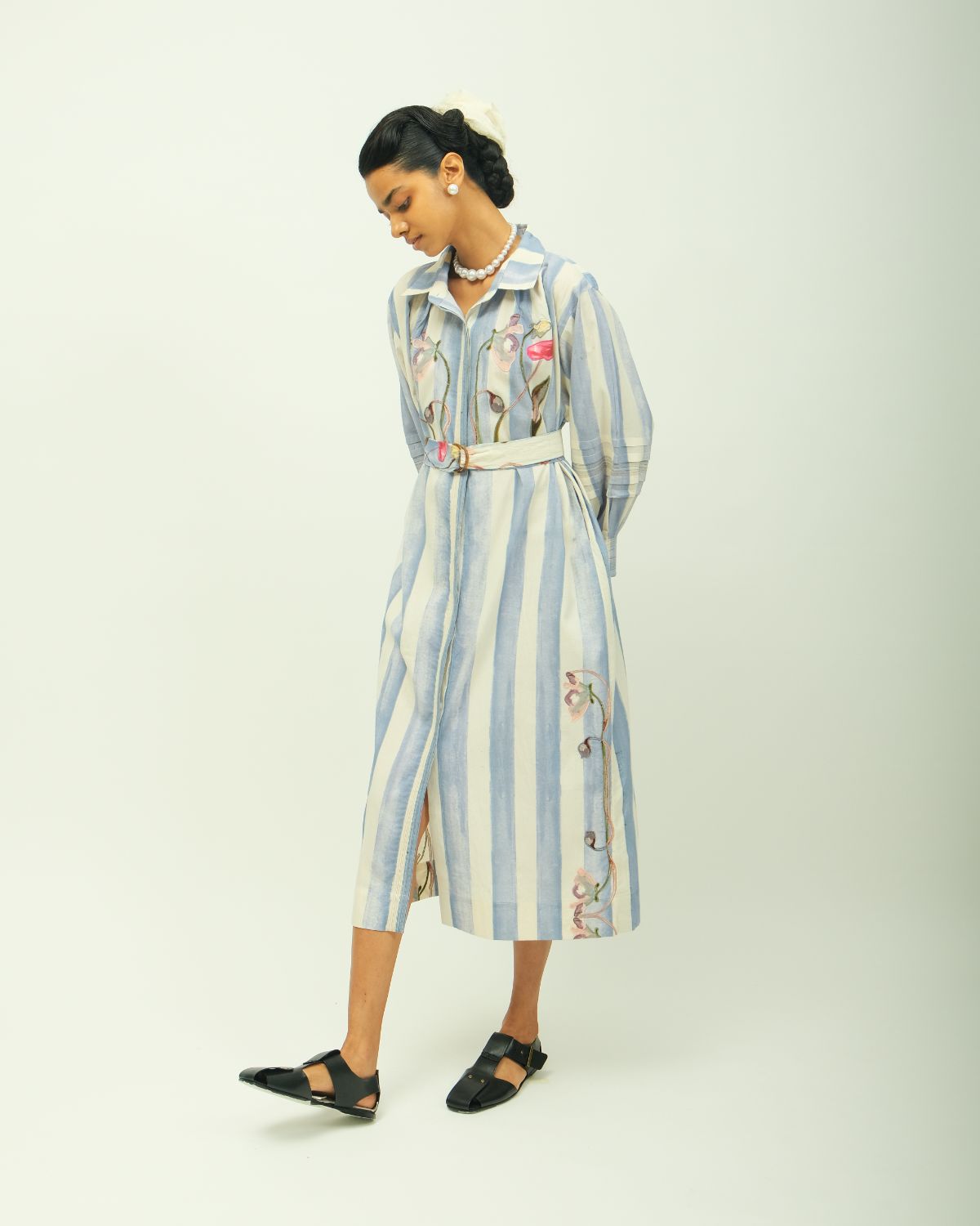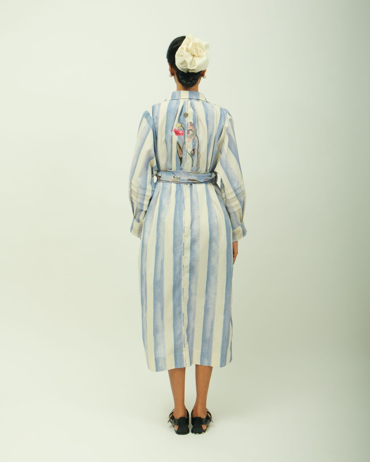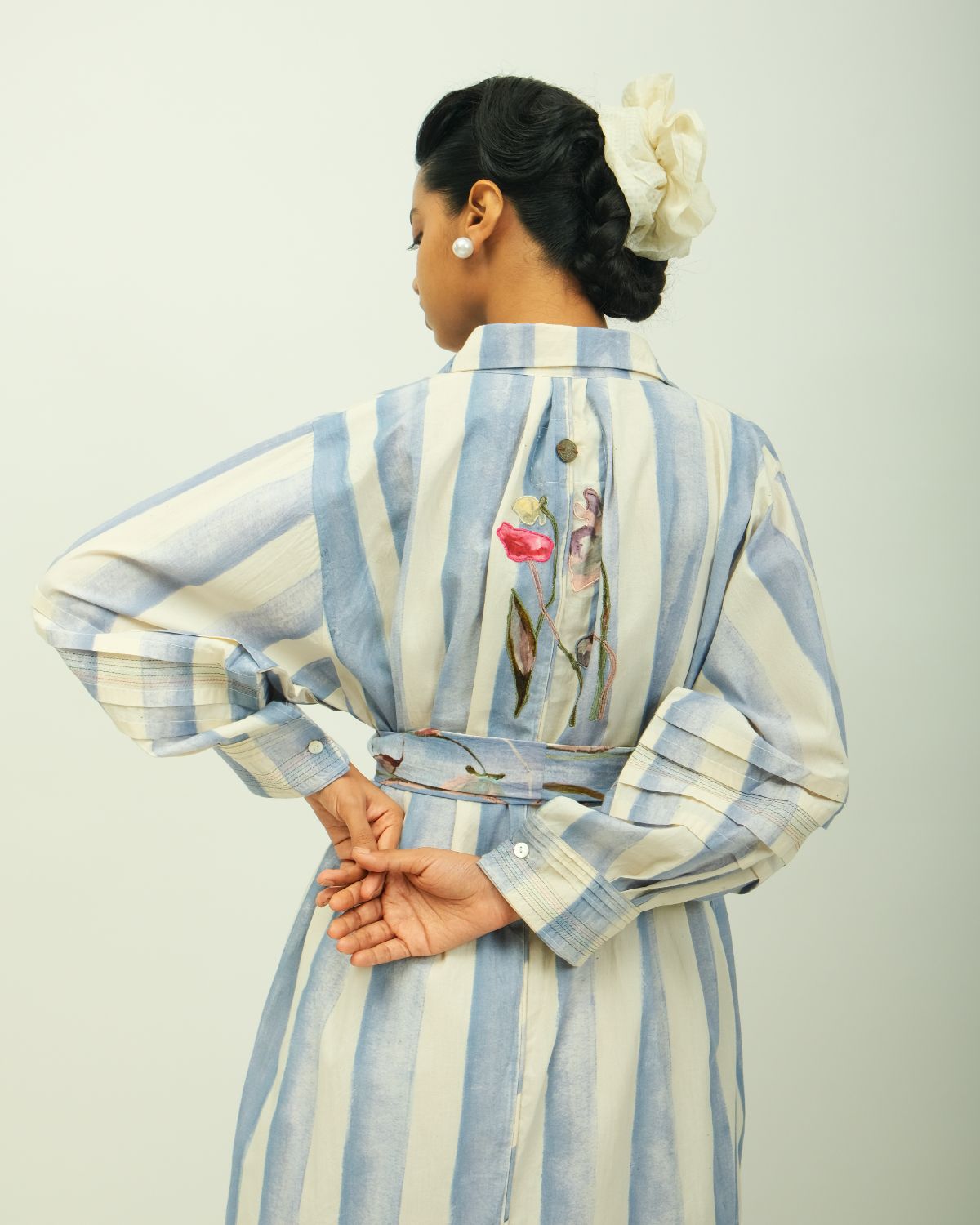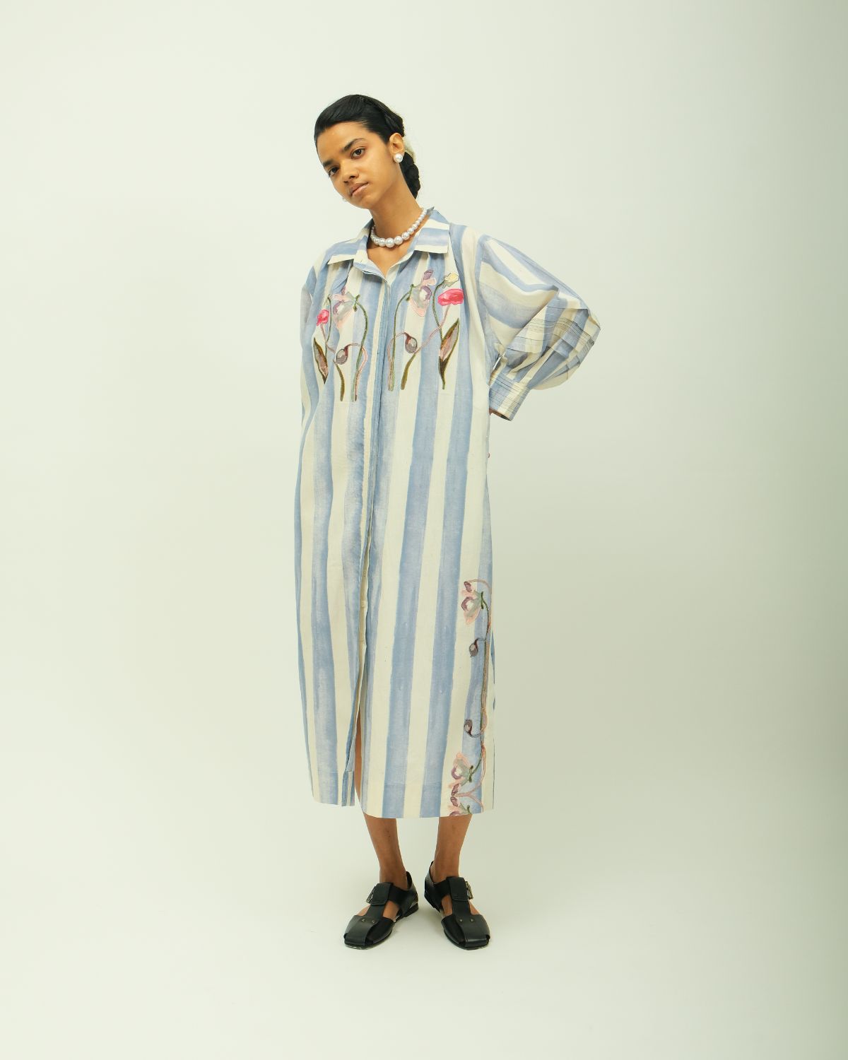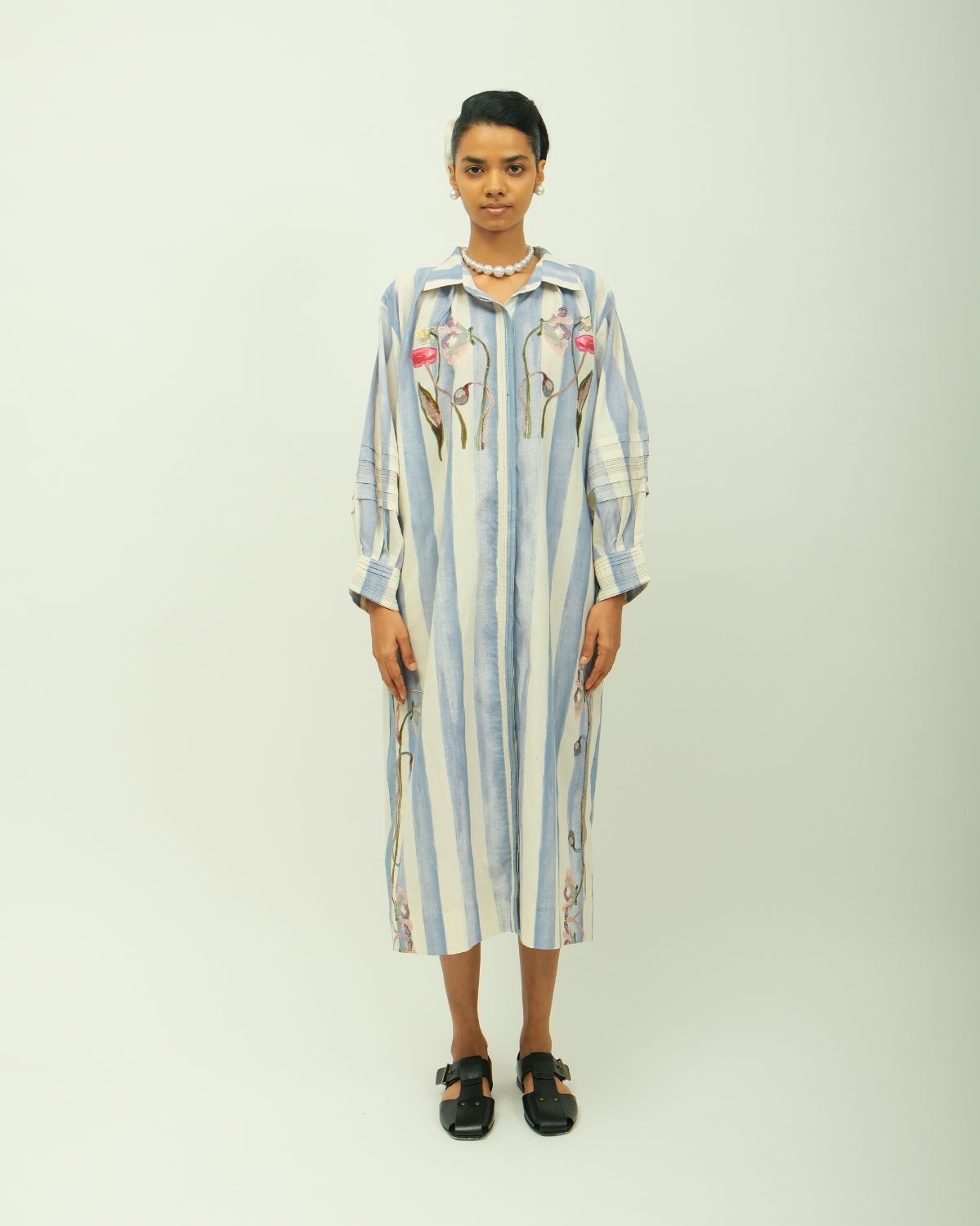 Anti-fit shirt dress featuring a classic shirt collar and long sleeves with stitch detailing. Designed with a concealed placket enhanced by vertical stitch lines and functional side pockets. The garment showcases a digitally transferred hand-painted abstract floral print, accented with floral appliqué work. Print placement may vary—each piece is one of a kind. Garment Length - 48"