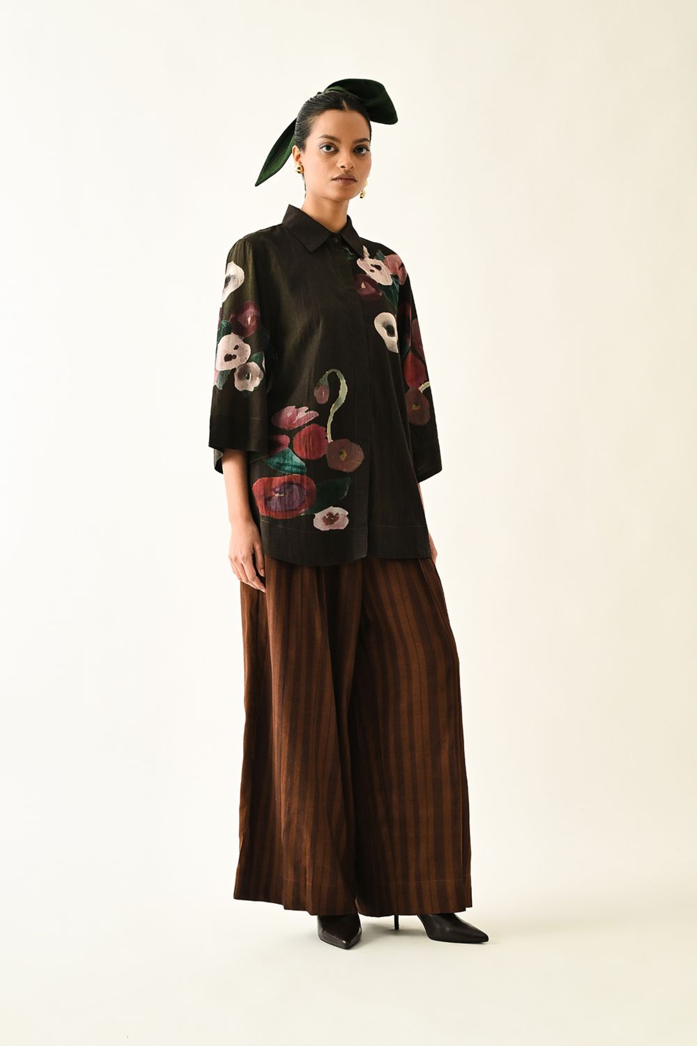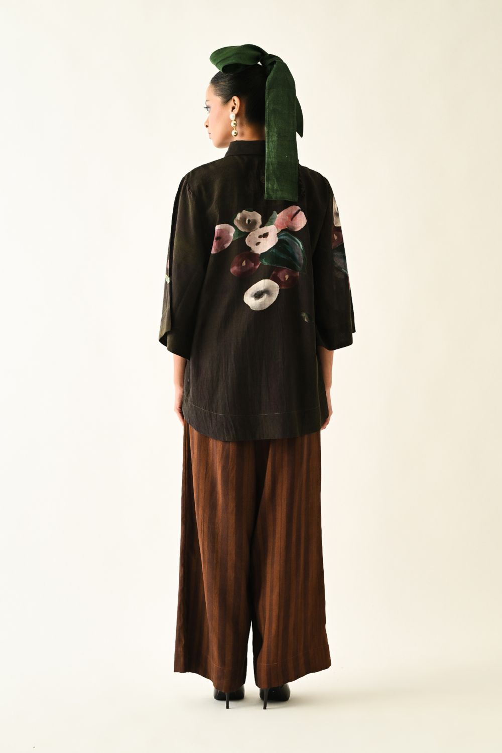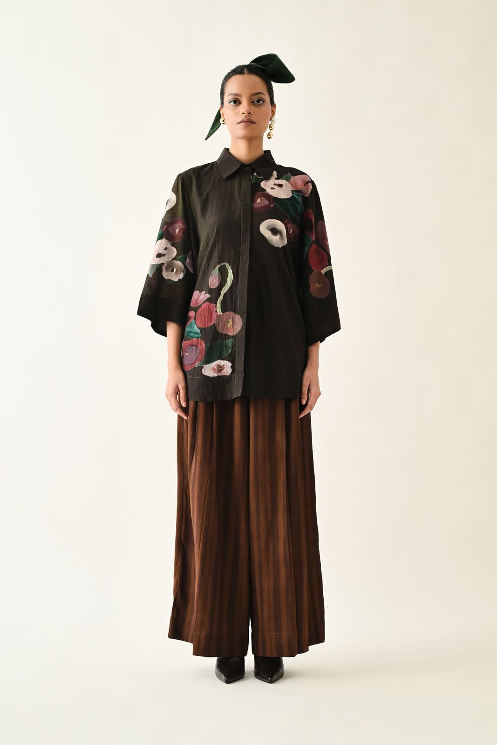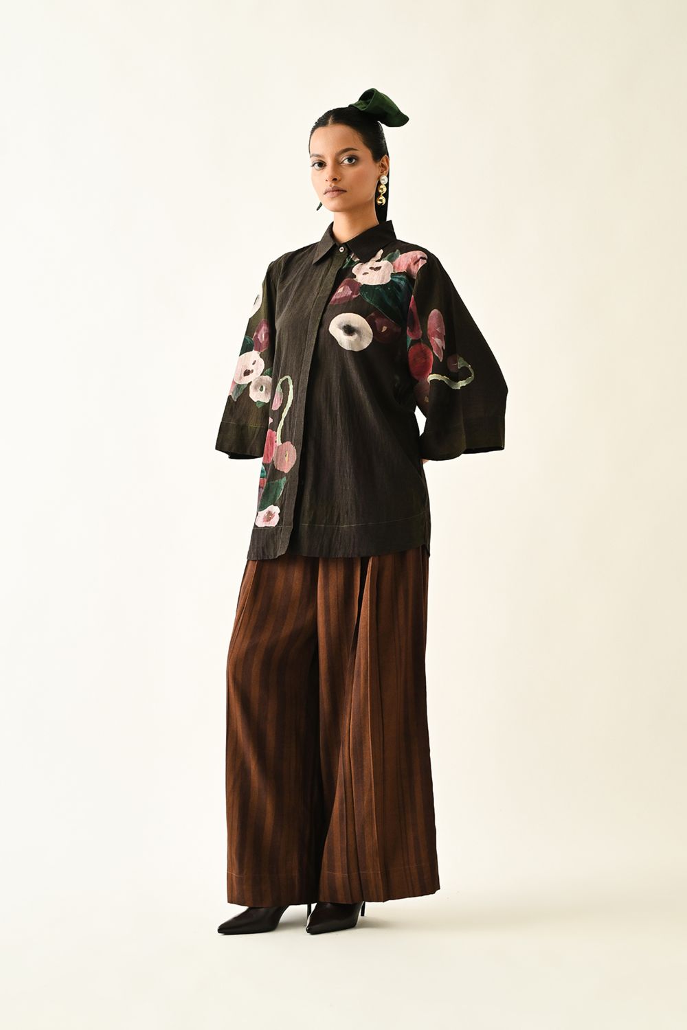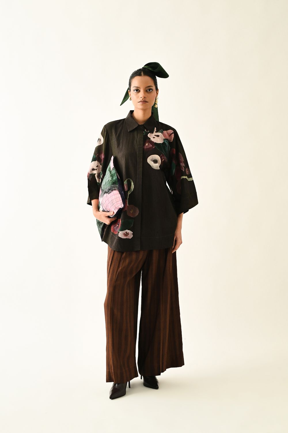 Top: Anti-Fit, Hand-painted abstract expressionist digitally transferred print, Shirt collar, front hidden placket. Print placements will vary—single Piece. Model is wearing XS/S