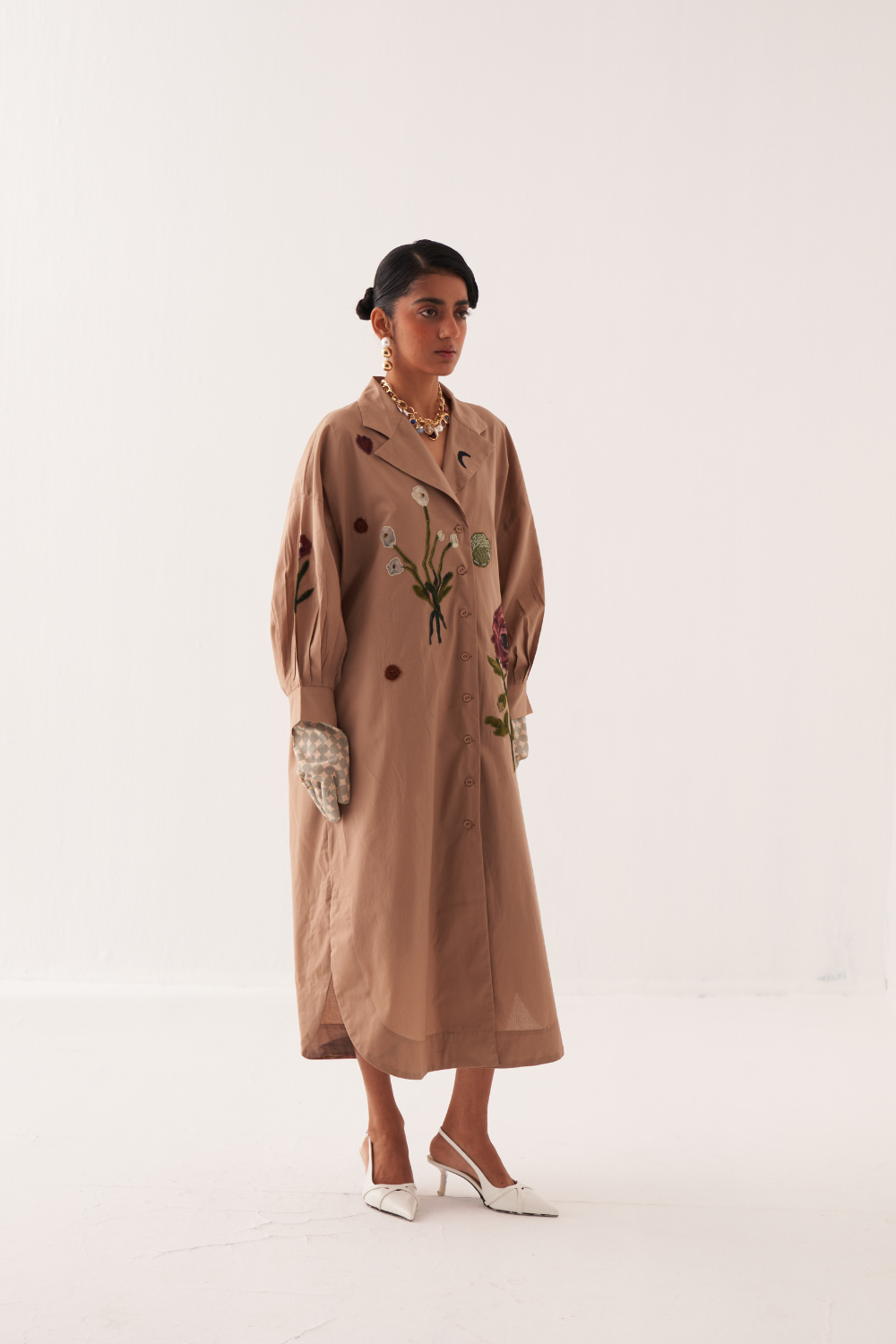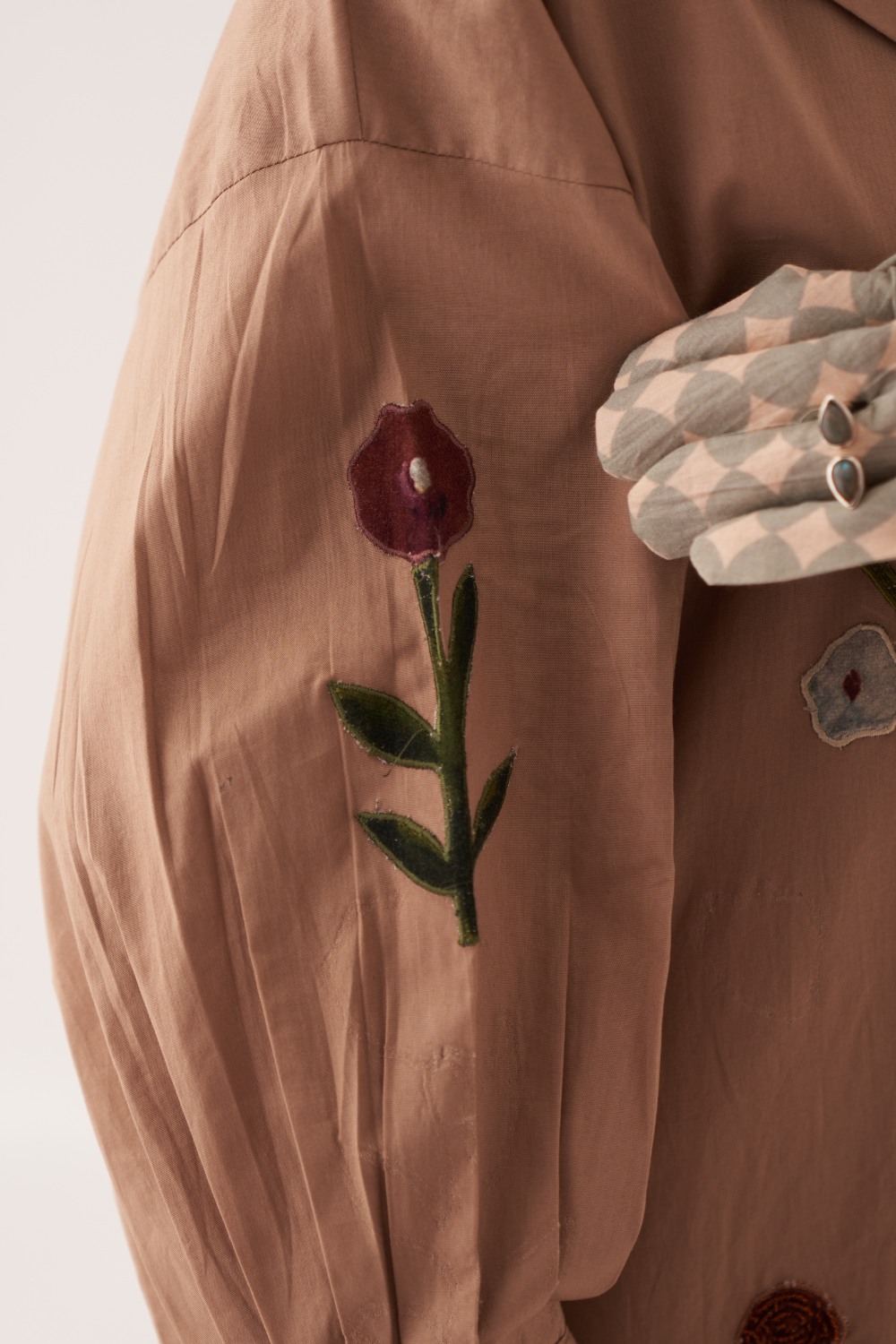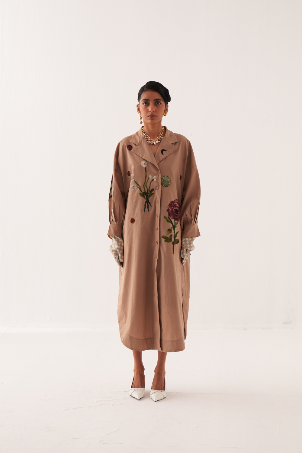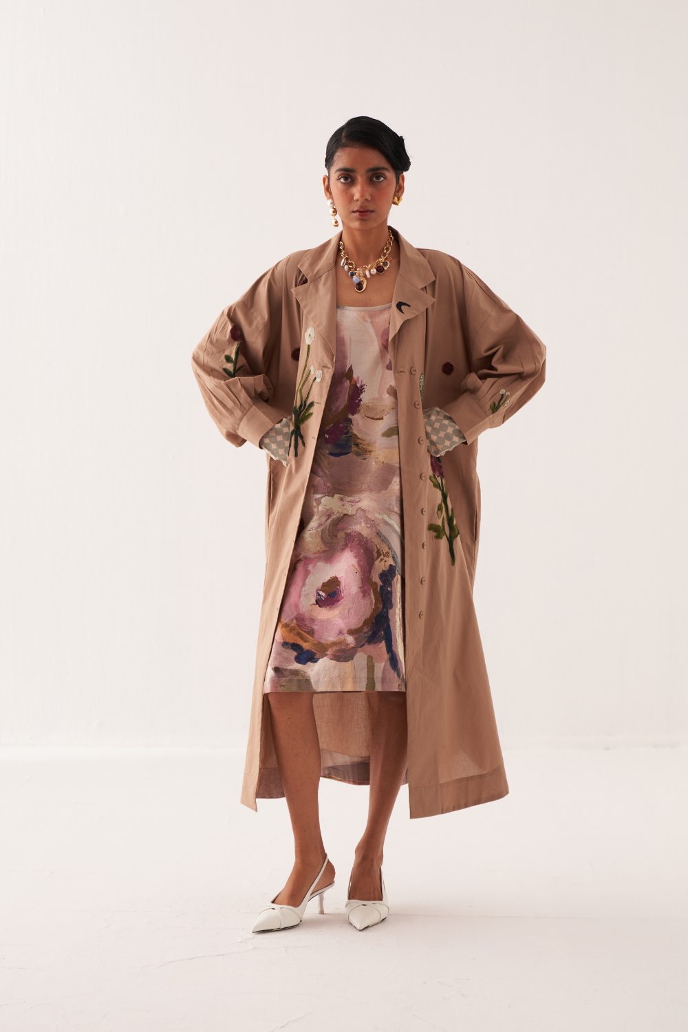 An Anti fit trench with Hand-painted abstract expressionist digitally transferred print, gathered sleeves, back yoke, box pleat at the back. Single thread embroidery on florals applique on front, back and sleeves with signature hand-embossed OFR lune embroidery. Print placement will vary - single piece. Model is wearing - XS/S.