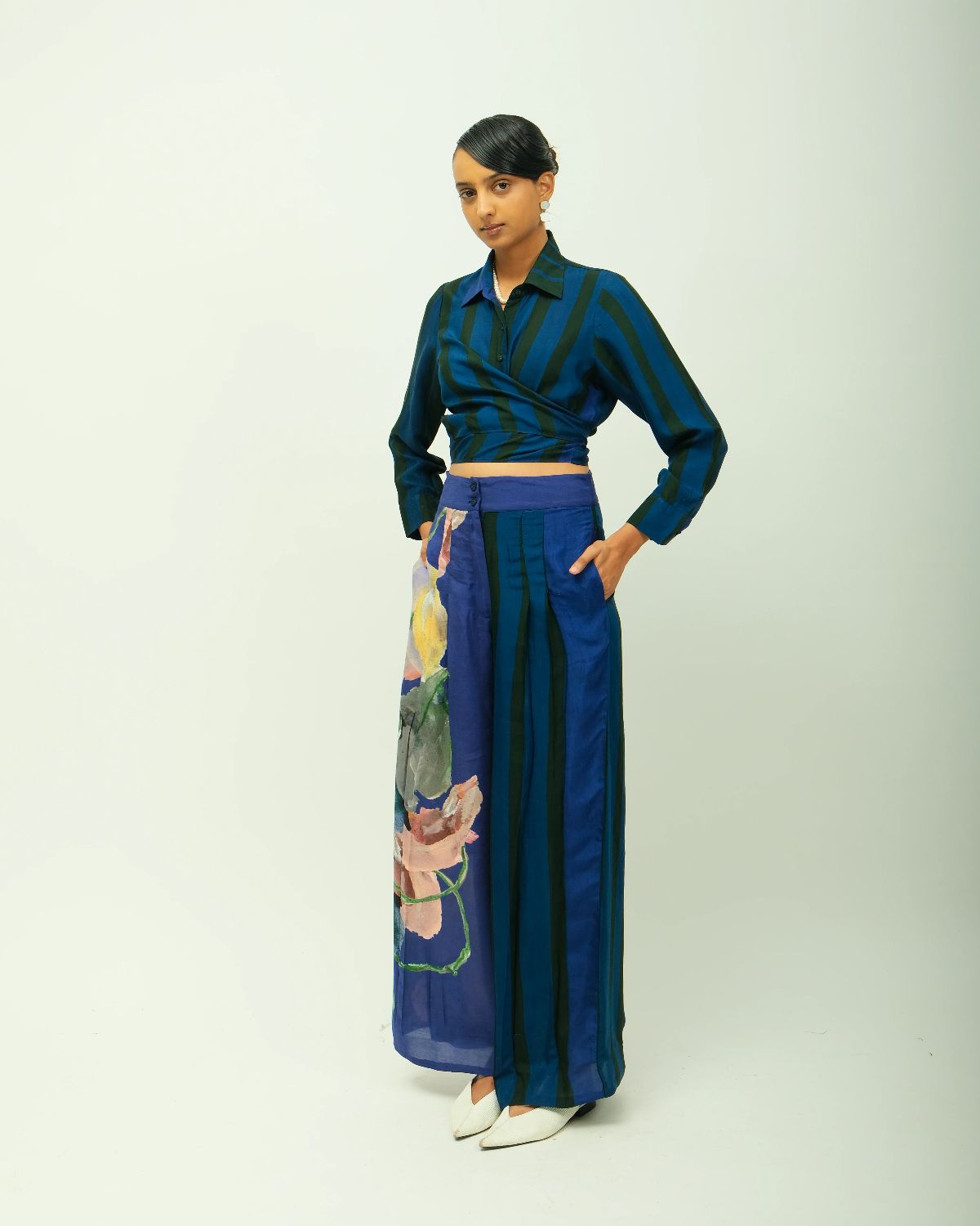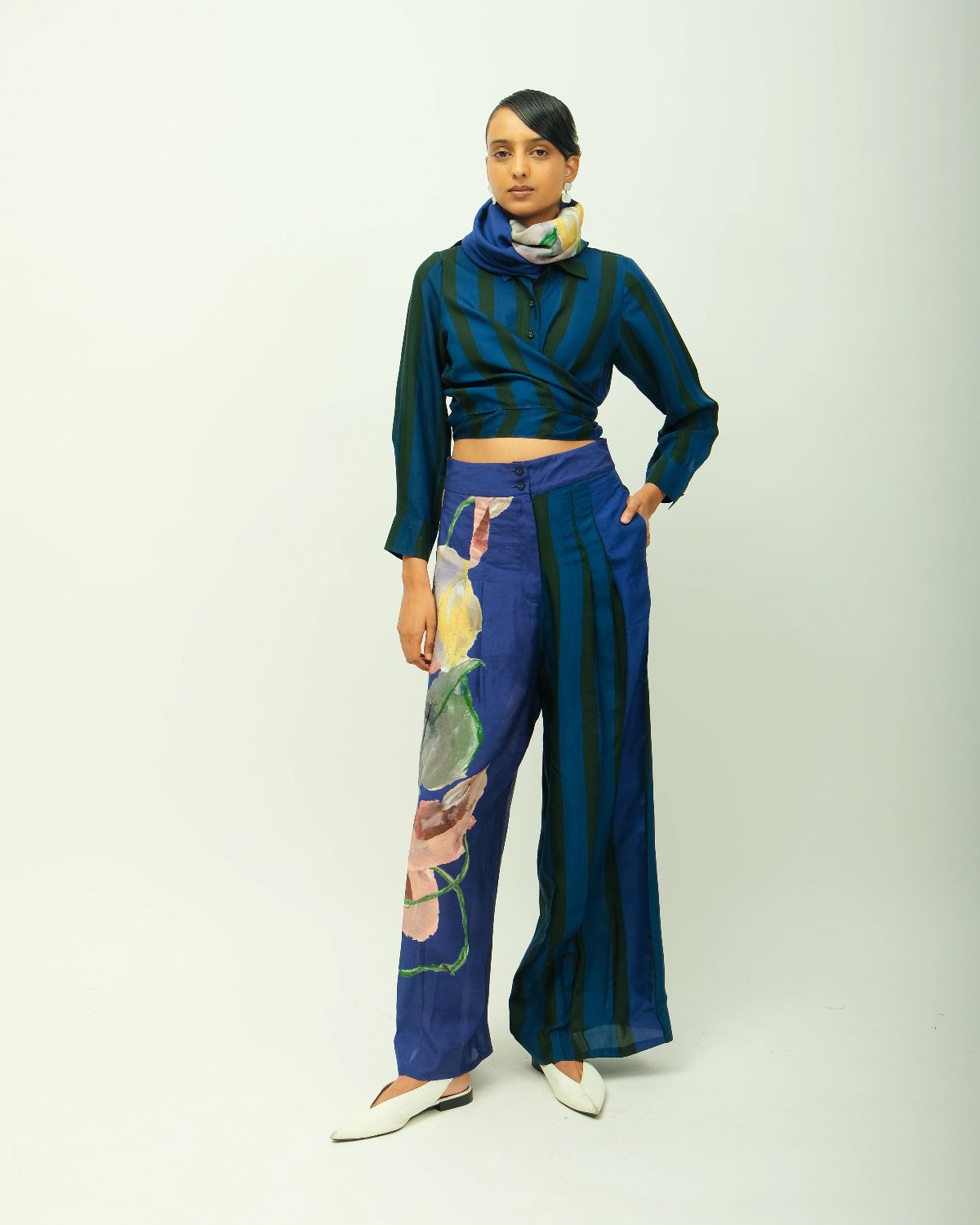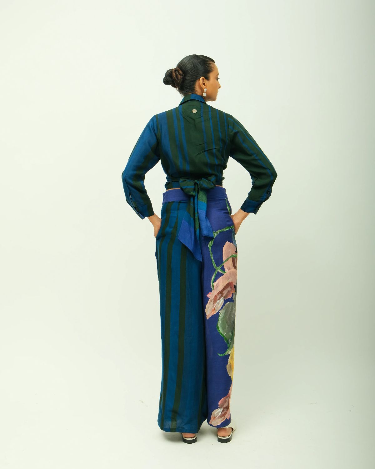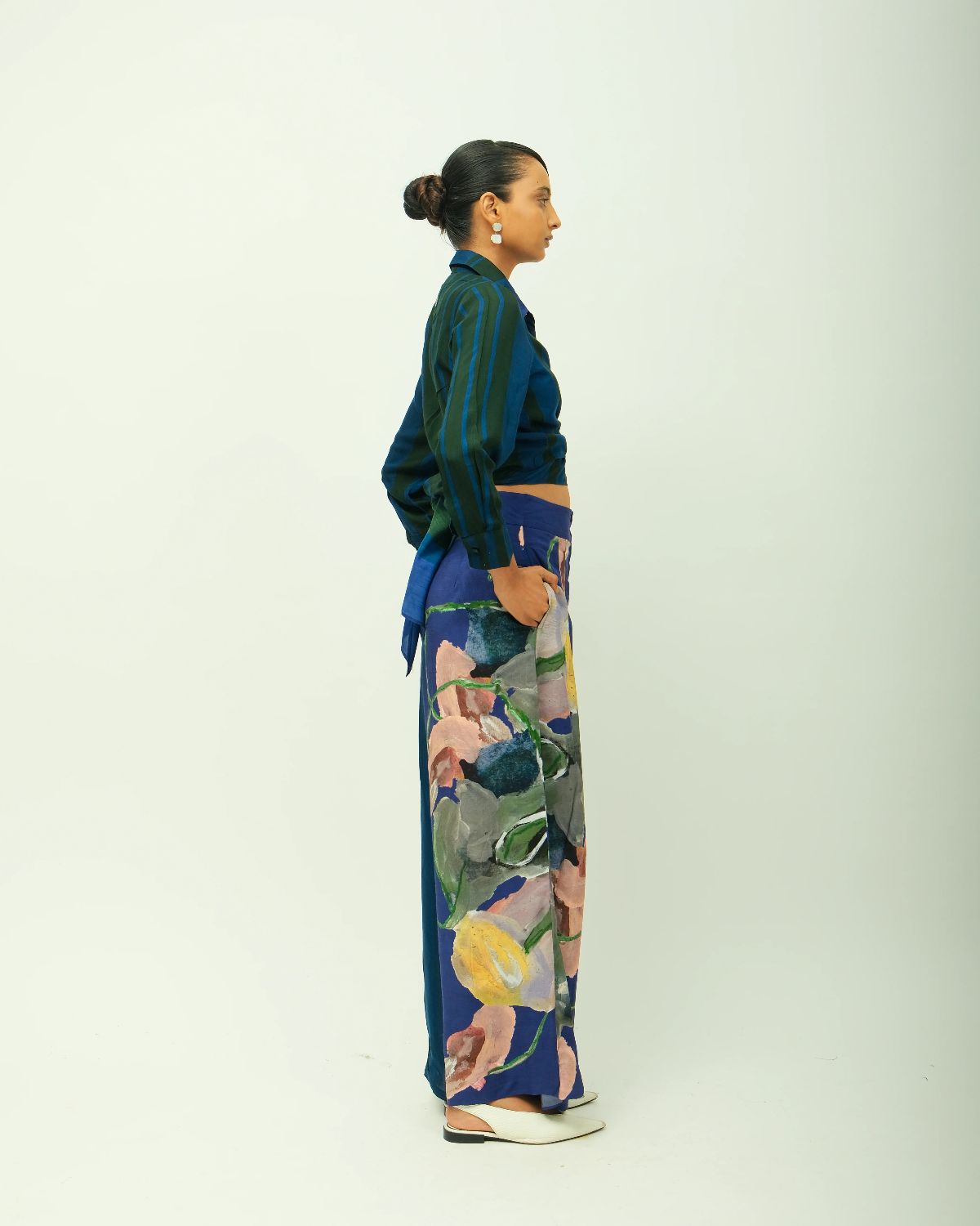 Anti fit, hand-painted abstract expressionist digitally transferred print, flared fit, front belt, back elasticated lowers comes with a drawstring, side pockets. Print placement will vary.