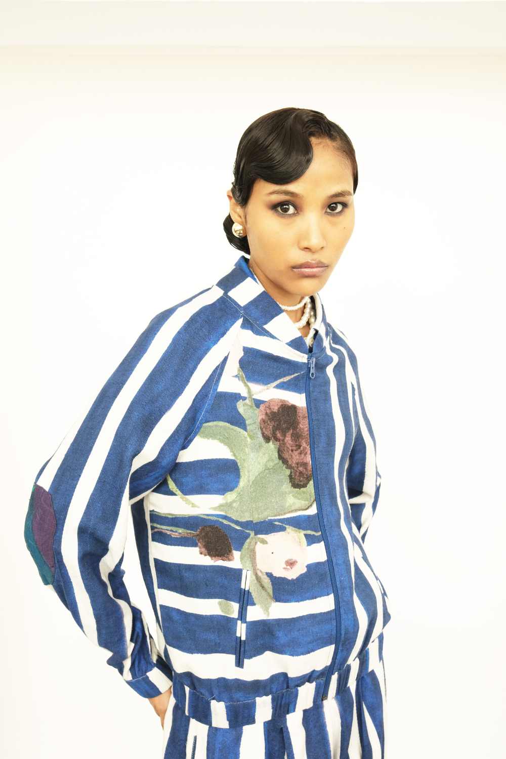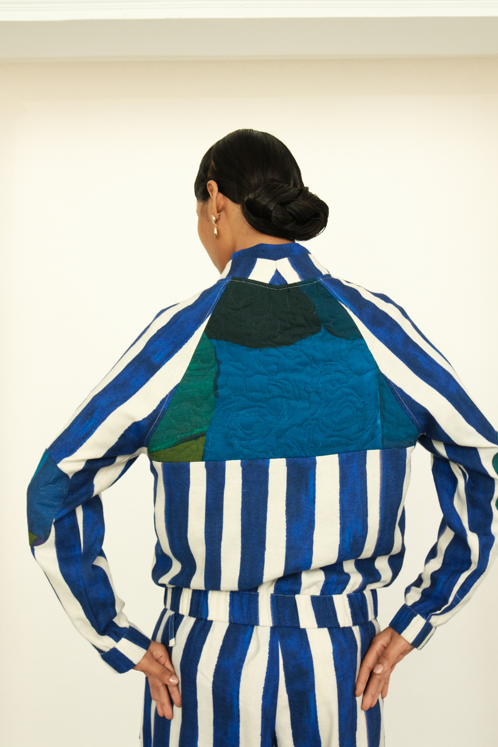 Anti-Fit Bomber, Hand-painted abstract expressionist digitally transferred print, Mandarin collar, front zip opening. Back quitted yoke and elbow patch. Elasticated hem. Double leap pockets. Print placements will vary—single Piece.