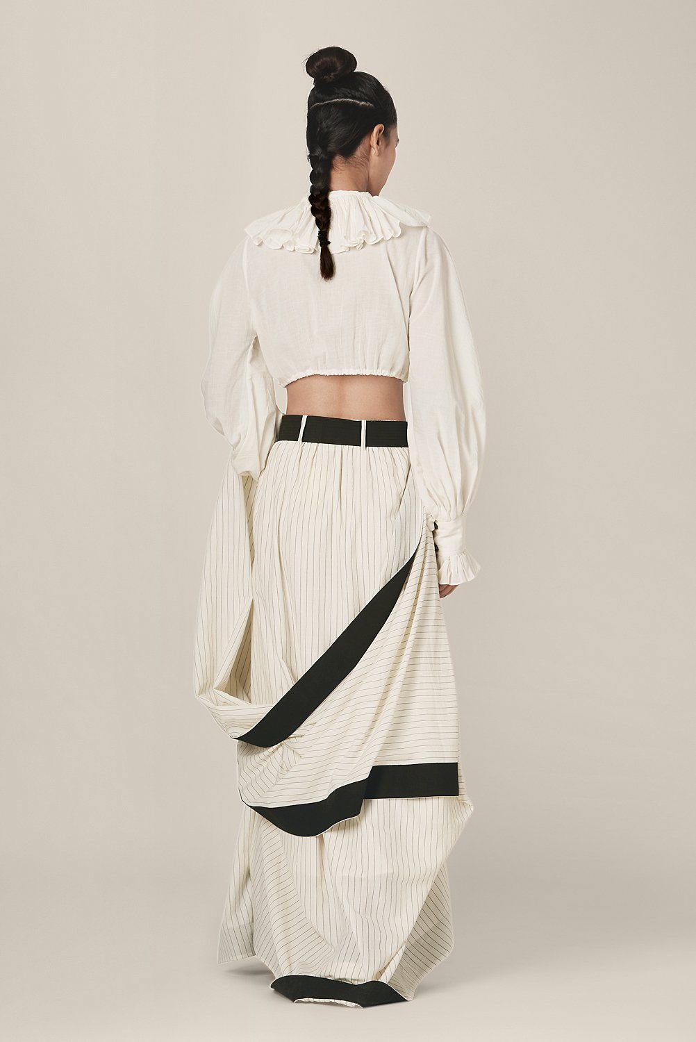 Chola’s universe begins with thoughtful materials. Recycled cottons, post-consumer fabrics, and free-cutting techniques come together in a kind of mindful choreography—one that honours form without creating waste, and prioritises movement over rigidity. This is clothing that feels lived-in yet architectural; pared-back yet quietly avant-garde.