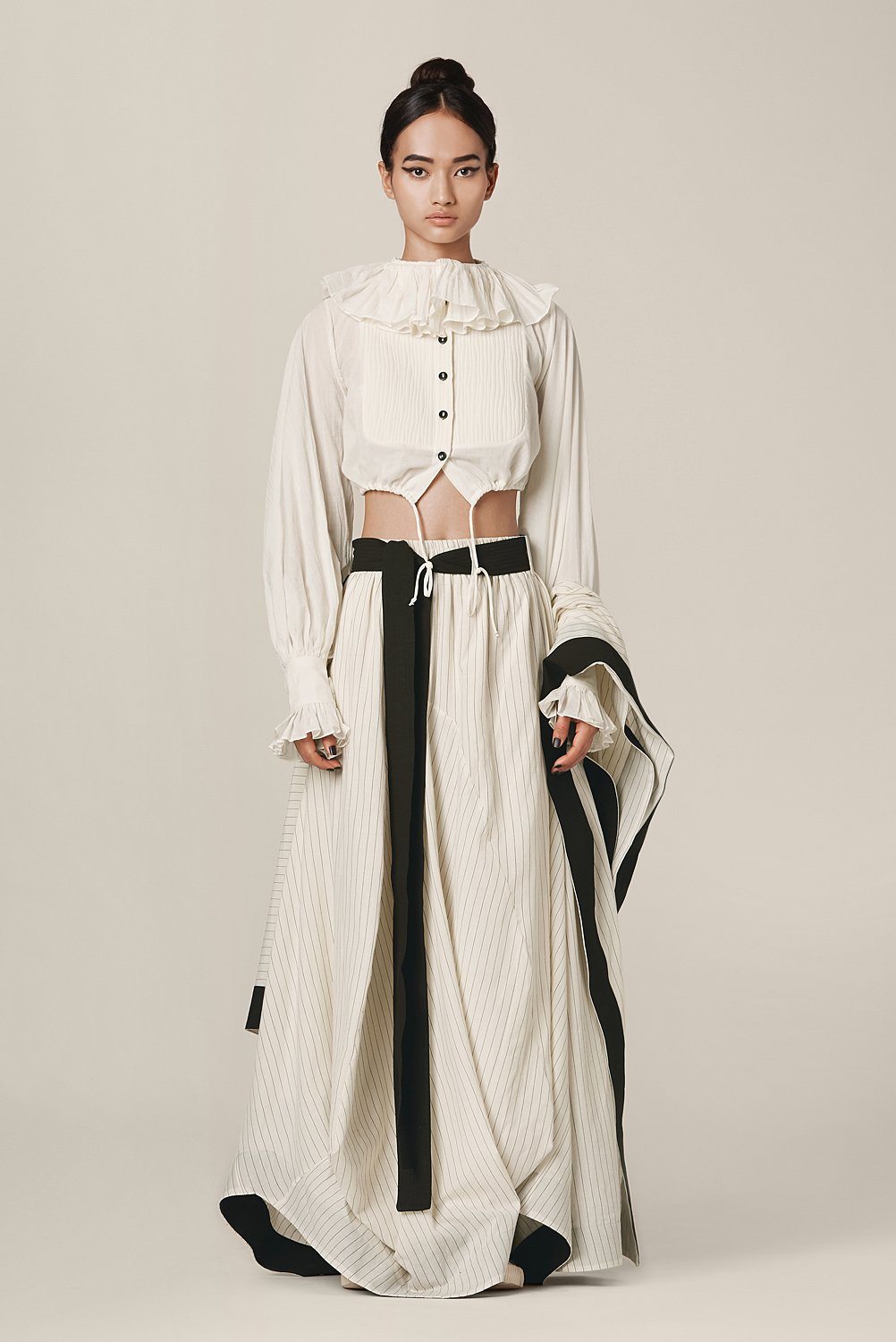 Ophelia Shirt features a frill collar, exaggerated bishop sleeve with ruffled cuff and drawstrings at the hem.