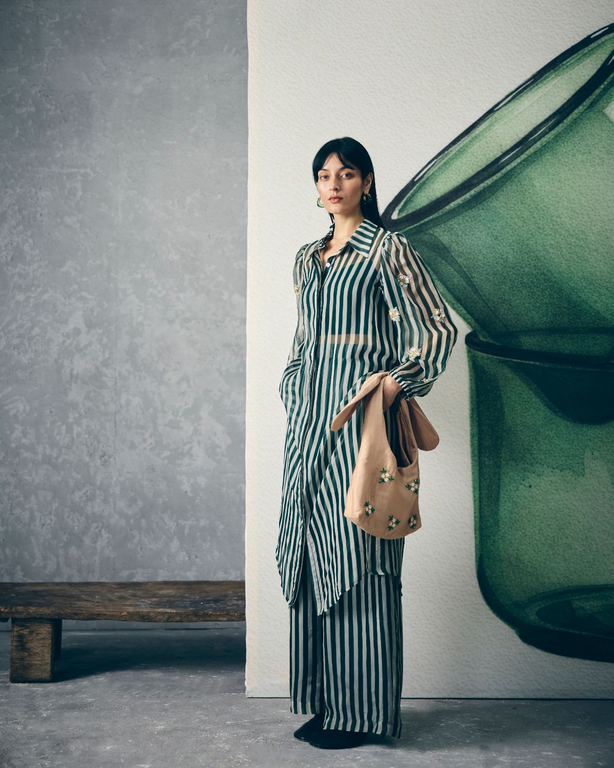 An elegant emerald green striped organza kurta with embroidery, styled with a solid bustier and matching pants.