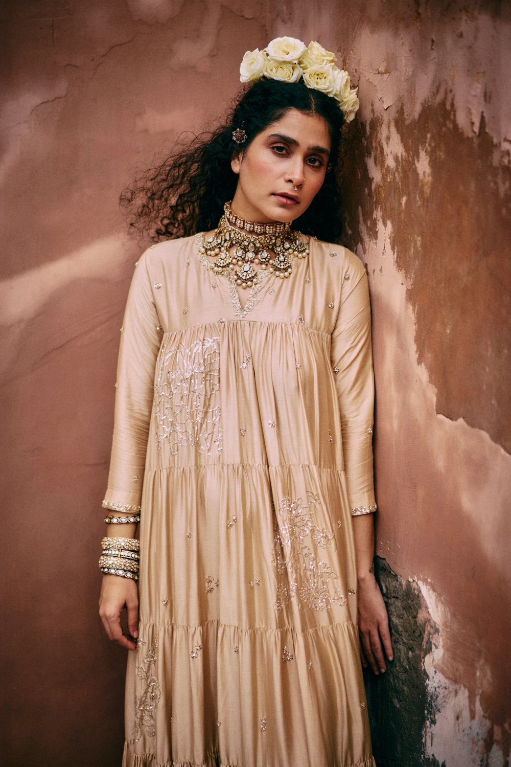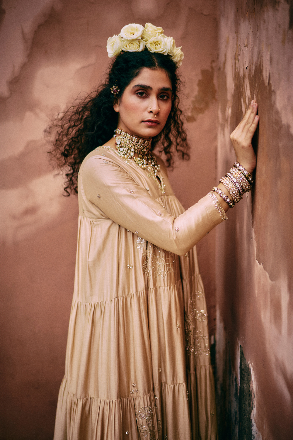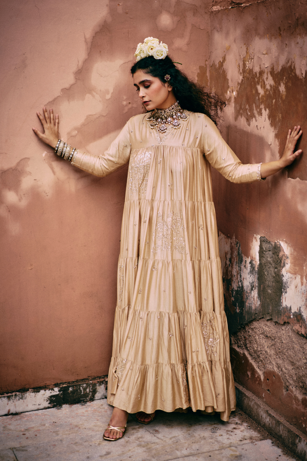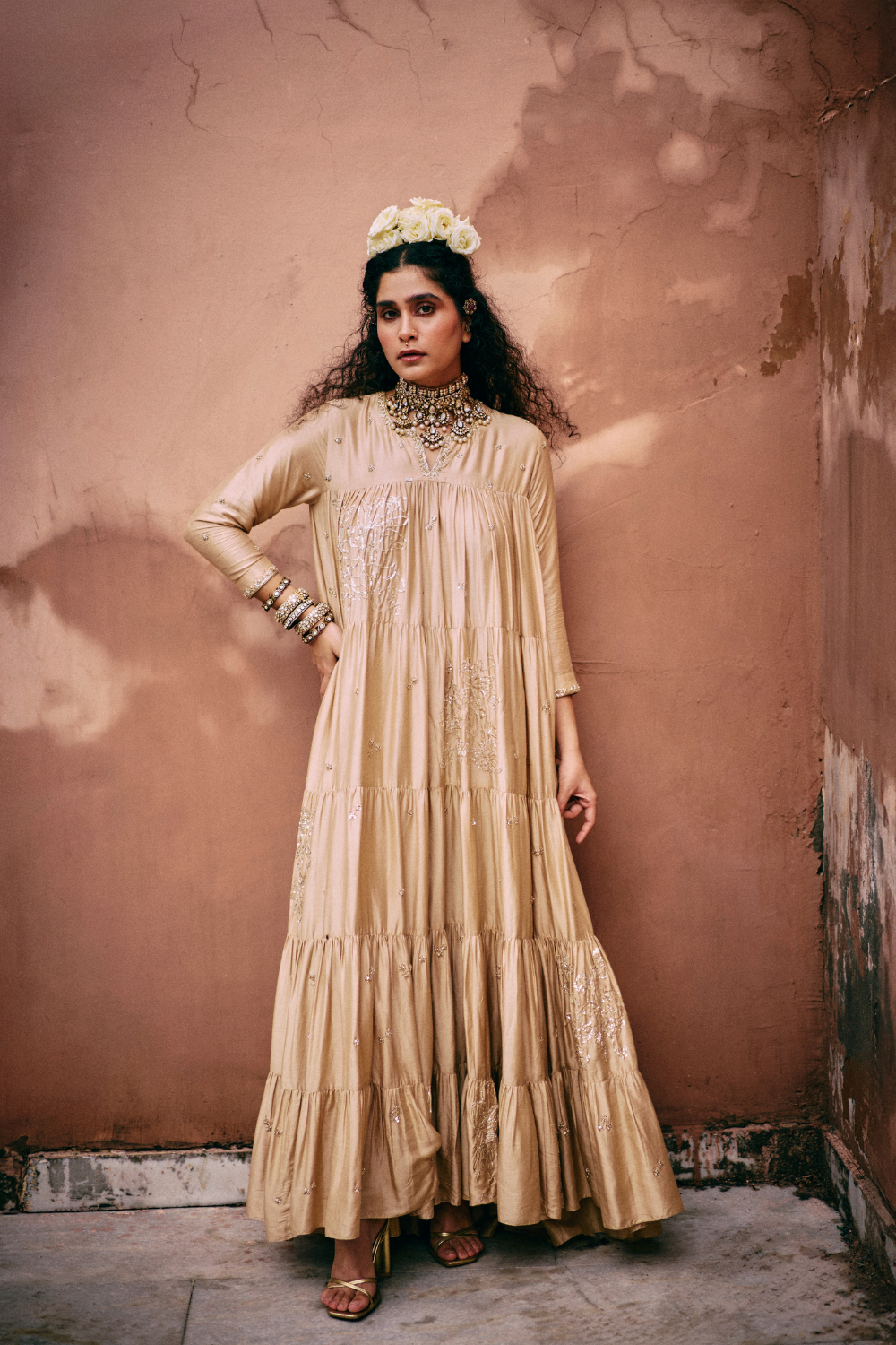 Every collection begins long before the garment is stitched: months of research into India’s rich craft traditions, followed by the painstaking creation of detailed illustrations. These artworks are then scanned, enhanced with jewel-toned palettes and touches of rich gold, and finally translated onto fabric. The result is a visual language so distinct that their name has become synonymous with print, colour, and the kind of glamour that still feels feather-light.