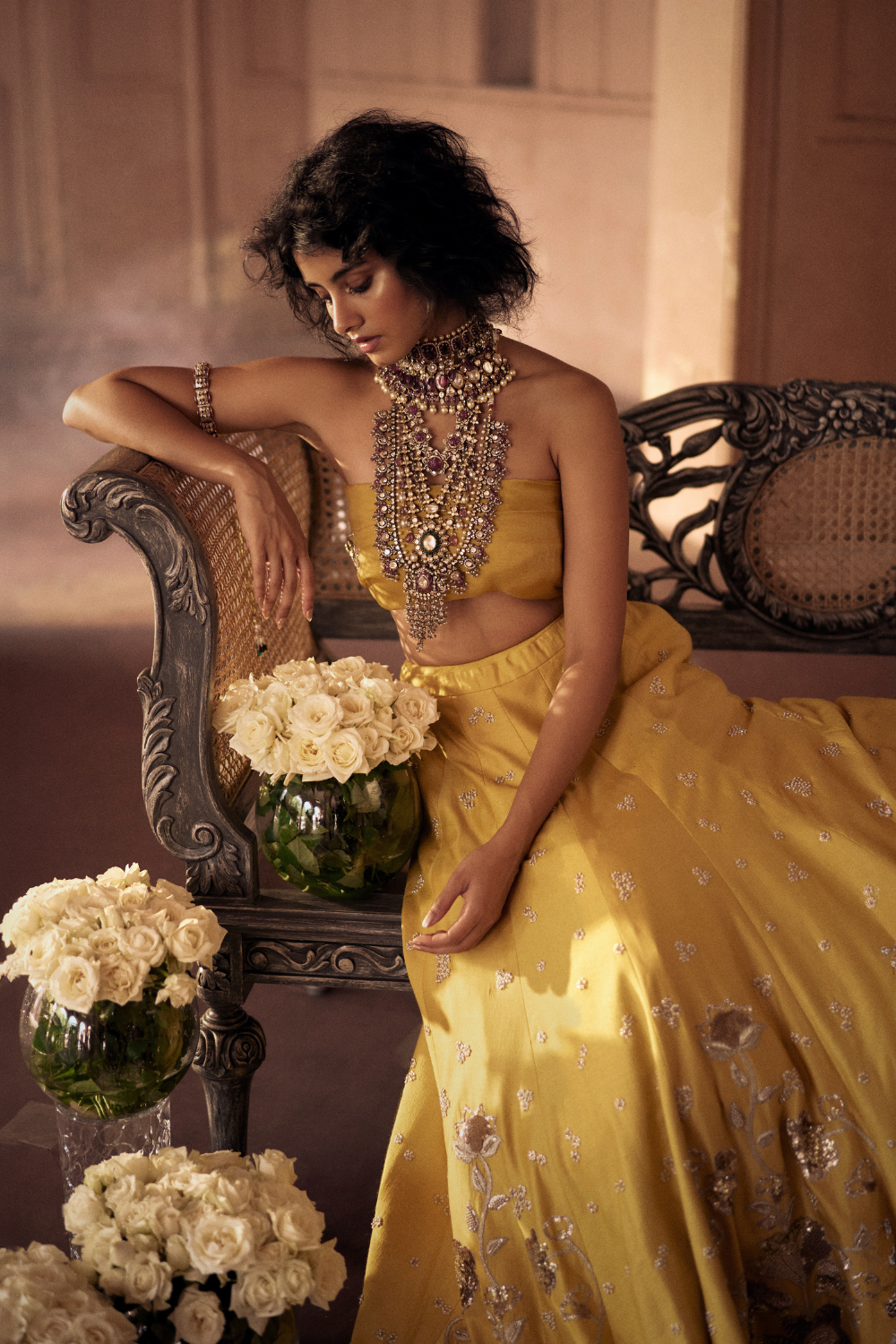 A tuscany yellow hand-embroidered lehenga set, featuring ornate aari and zardozi embroidery, in alternating kalis of chintz and small floral buttis. It is paired with a hand-embroidered dupatta, featuring floral bunches and double scallop embroidered borders.