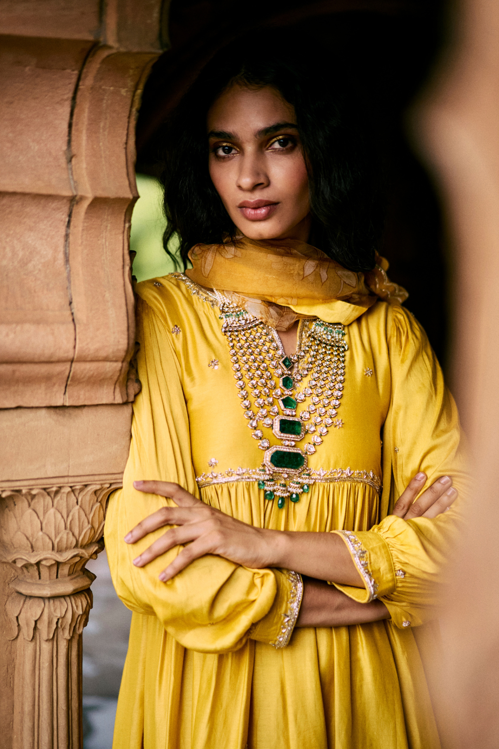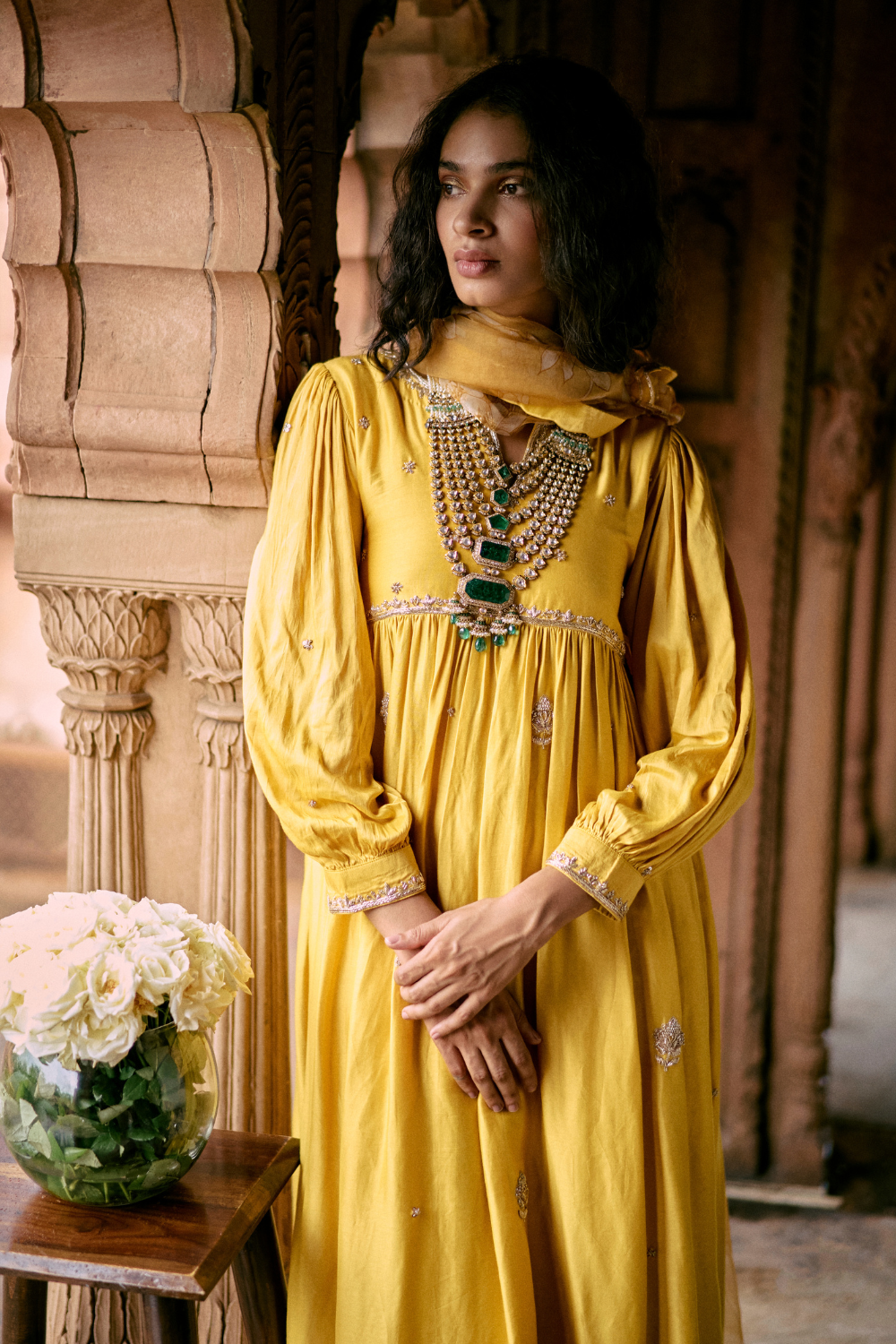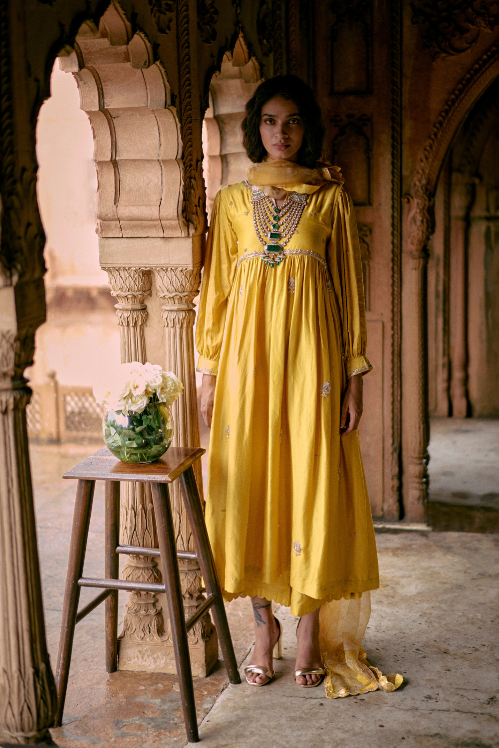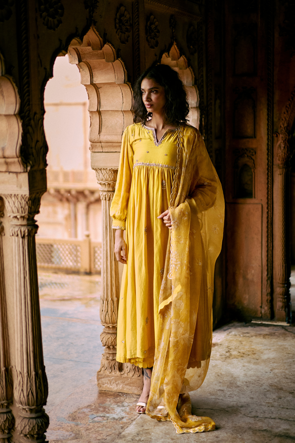 a tuscany yellow hand embroidered anarkali set, featuring ornate aari and zardosi embroidery, It is paired with a hand embroidred dupatta, Featuring our baby florals and double scallop embroidred borders with pants.
