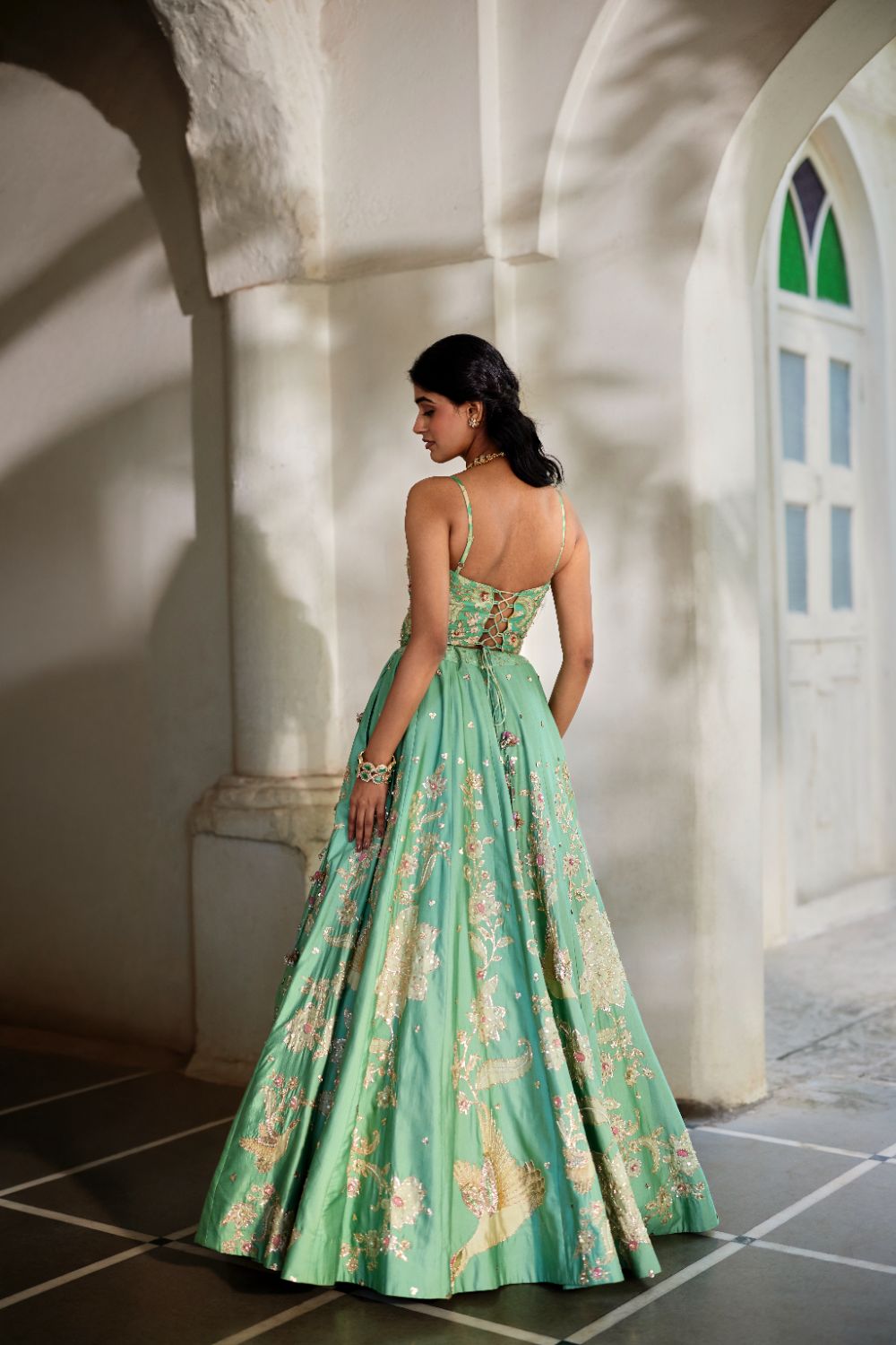 A silk lehenga featuring delicate floral prints enhanced with intricate aari, zardozi, and sequin hand-embroidery. Paired with a corset-fit blouse adorned with exquisite handwork, and a sheer organza triangular cape embellished with fine hand-embroidered accents.