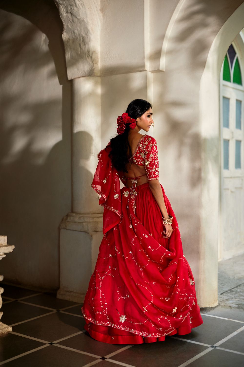 Every collection begins long before the garment is stitched: months of research into India’s rich craft traditions, followed by the painstaking creation of detailed illustrations. These artworks are then scanned, enhanced with jewel-toned palettes and touches of rich gold, and finally translated onto fabric. The result is a visual language so distinct that their name has become synonymous with print, colour, and the kind of glamour that still feels feather-light.