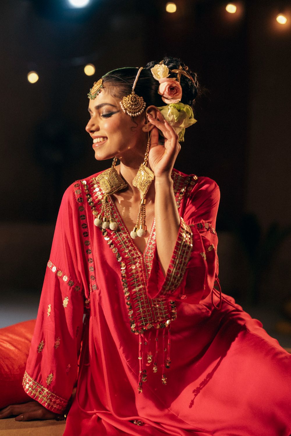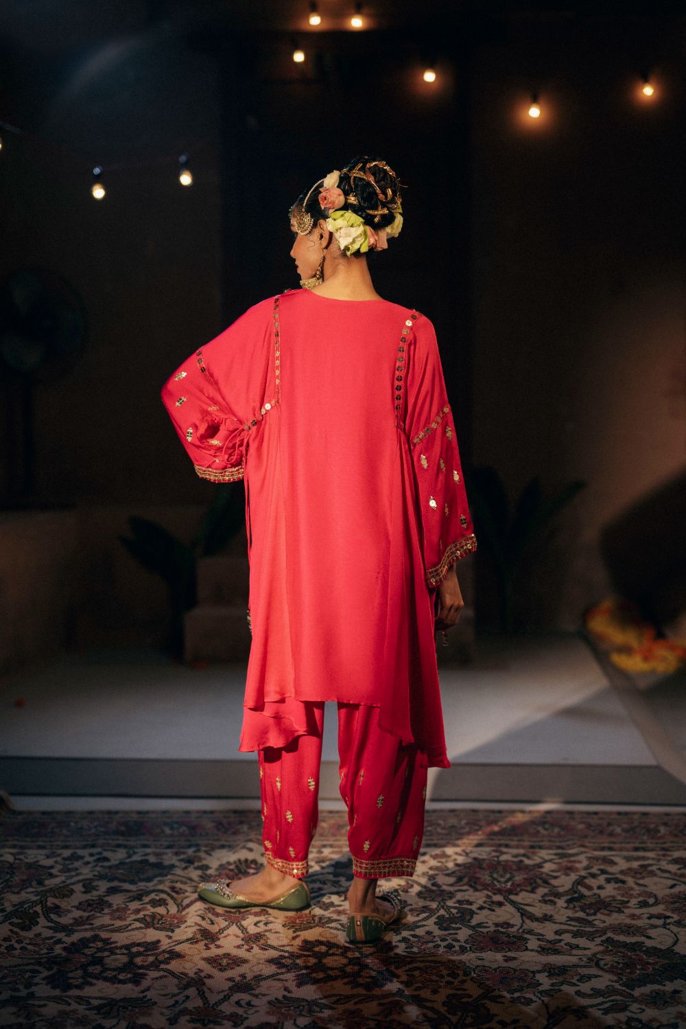 Featuring emerald green satin silk high-low kurta that is hand embroidered and finished with hand crafted fringes at the back. The set comes with a matching dhoti pants.
