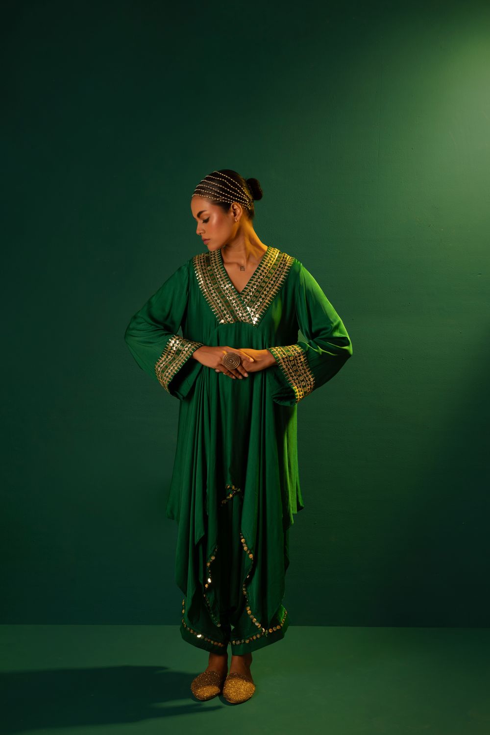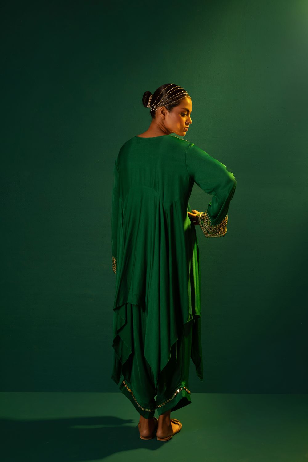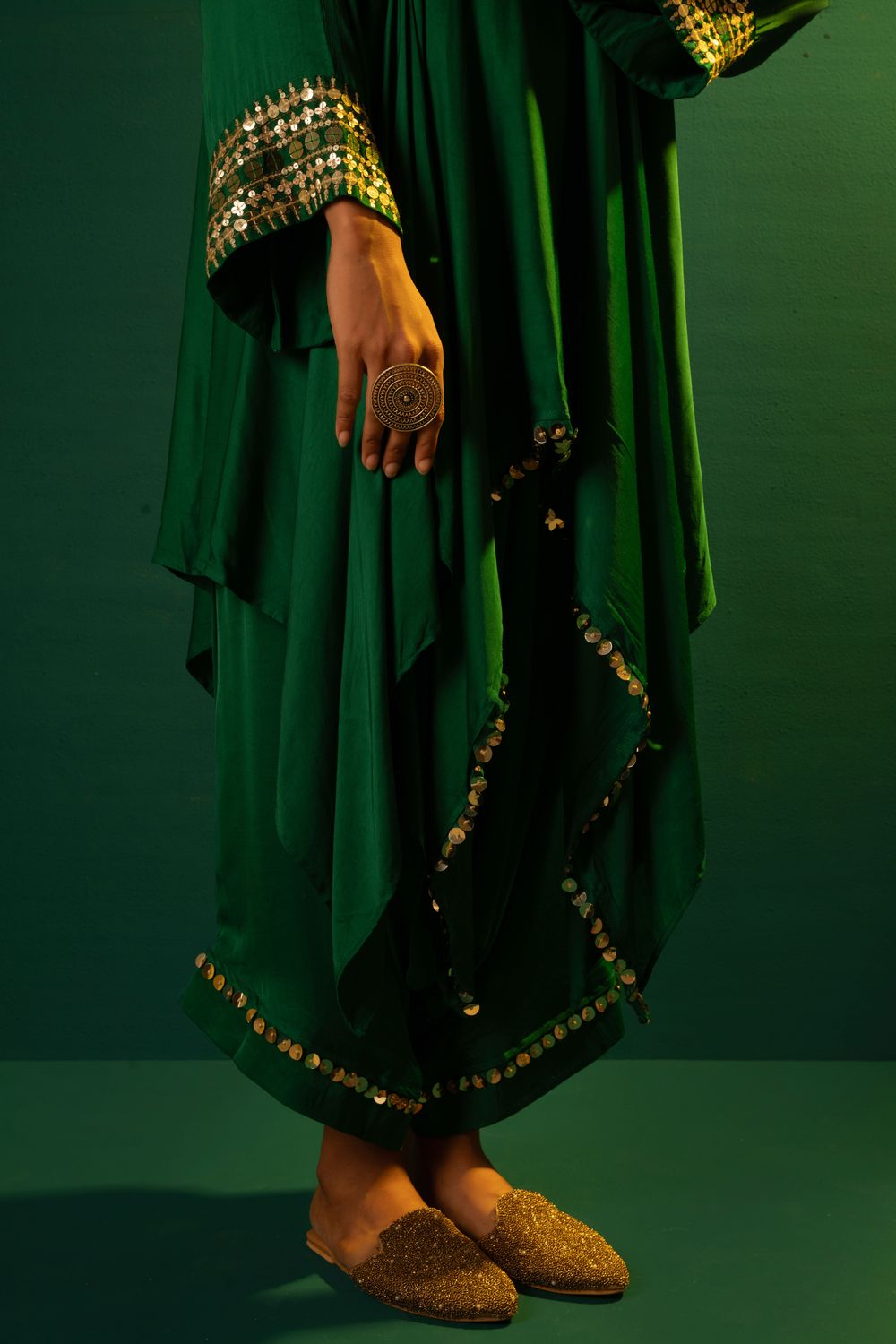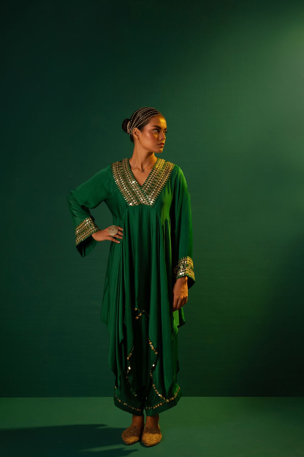 Emerald Green High-Low Kurta with hand embroidered mirror look alike coin & reflective sequin lace .The set is completed with harem style pants