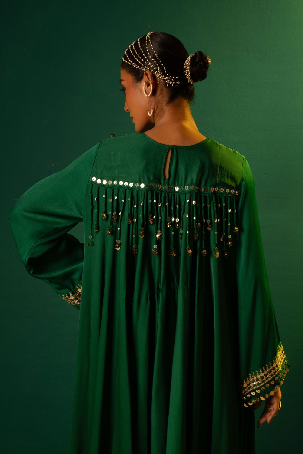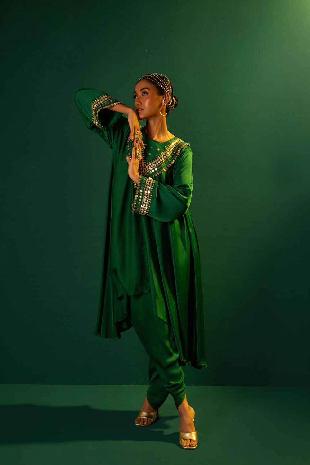 Featuring emerald green satin silk high-low kurta that is hand embroidered and finished with hand crafted fringes at the back. The set comes with a matching dhoti pants.
