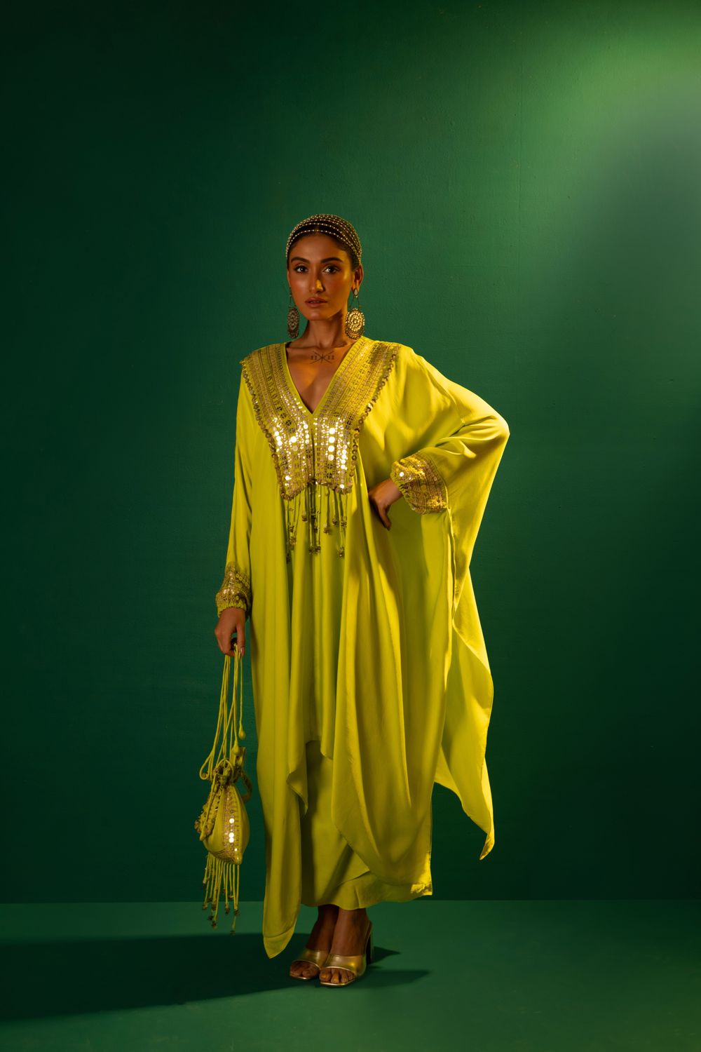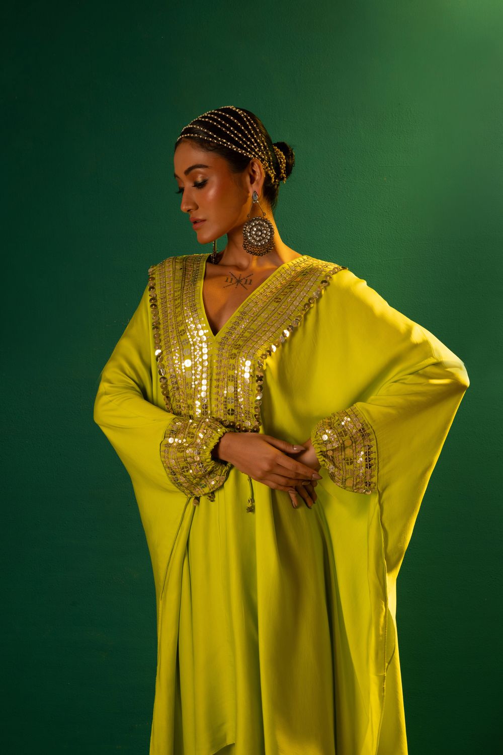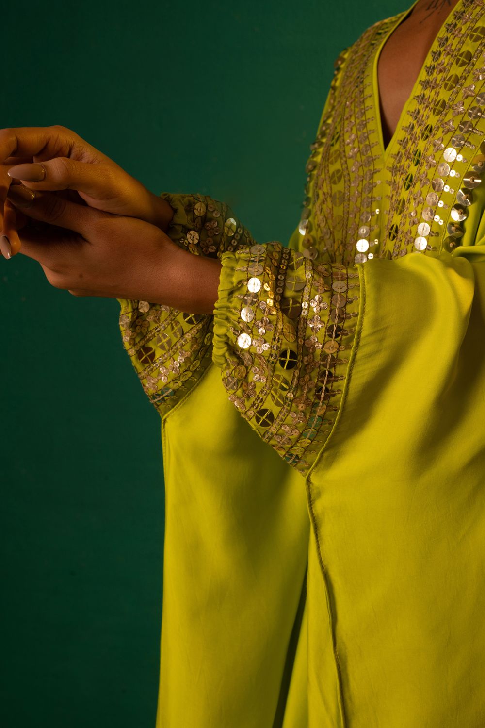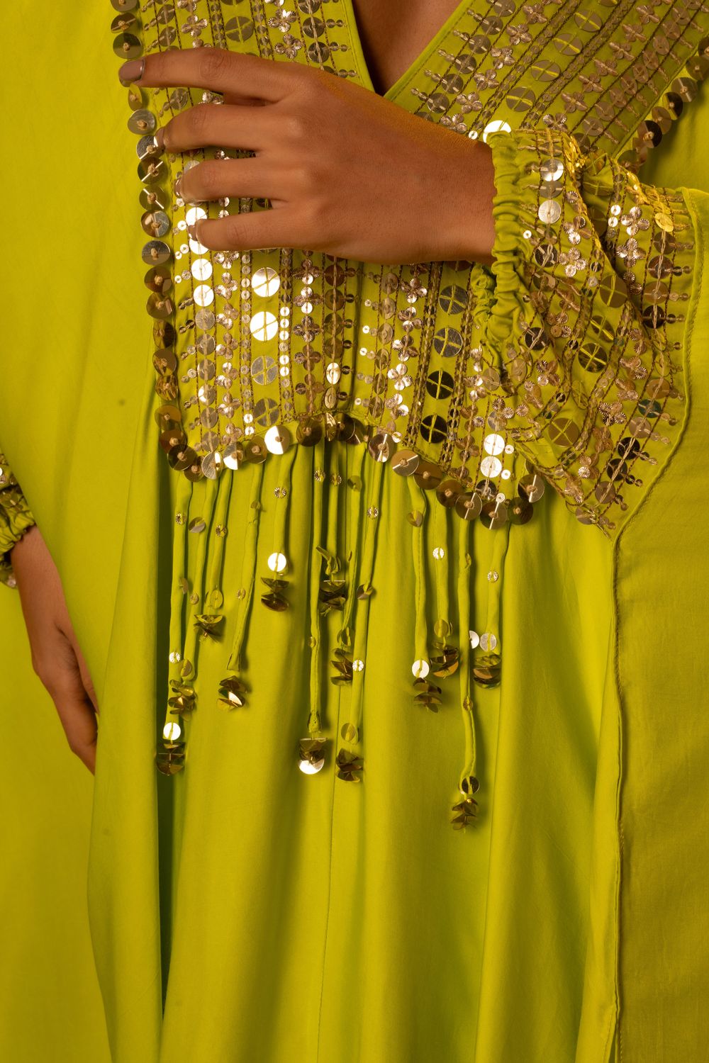 Sublime Neon Kaftaan with hand embroidered mirror look alike coin & reflective sequin lace with hand folded coin sequin lace to give a starry glow.The set is completed with Pants