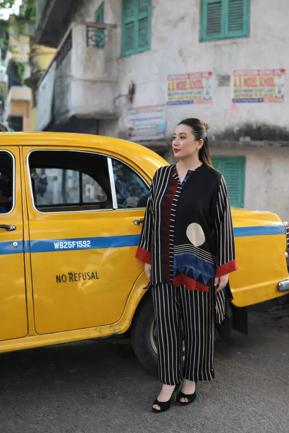 A statement co-ord set featuring bold vertical stripes and geometric patterns in black, highlighted with accents of red, white, and blue. The hi-low relaxed shirt is designed for everyday social and professional commitments, seamlessly transitioning from office wear to after-office style while embodying a sustainable ethos. Model height is 5'5" and is wearing a size L.