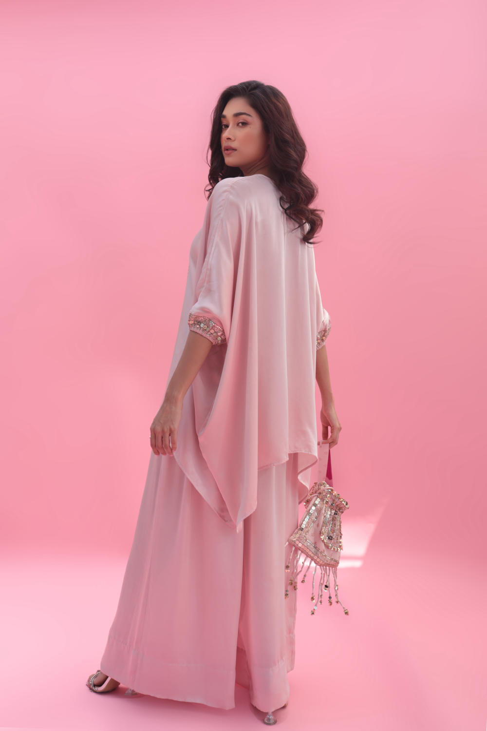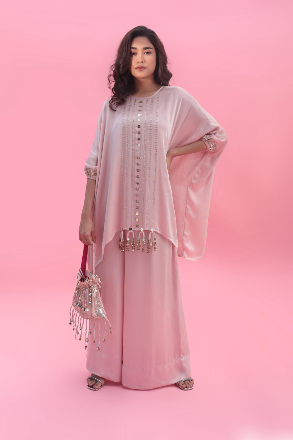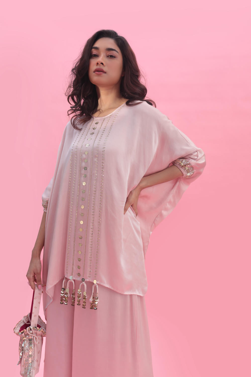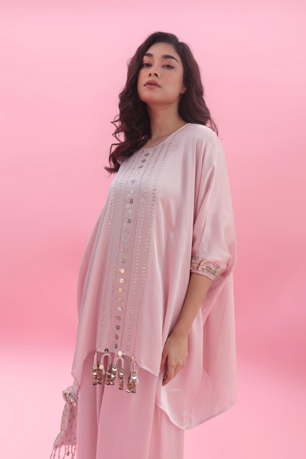 Embrace elegance with our pastel pink anti-fit hand-embroidered tunic, adorned with captivating mirror-like sequins. Complete your look with coordinated pants or a fashionable dhoti skirt. Perfect for fashion-forward individuals, this ensemble exudes modern sophistication