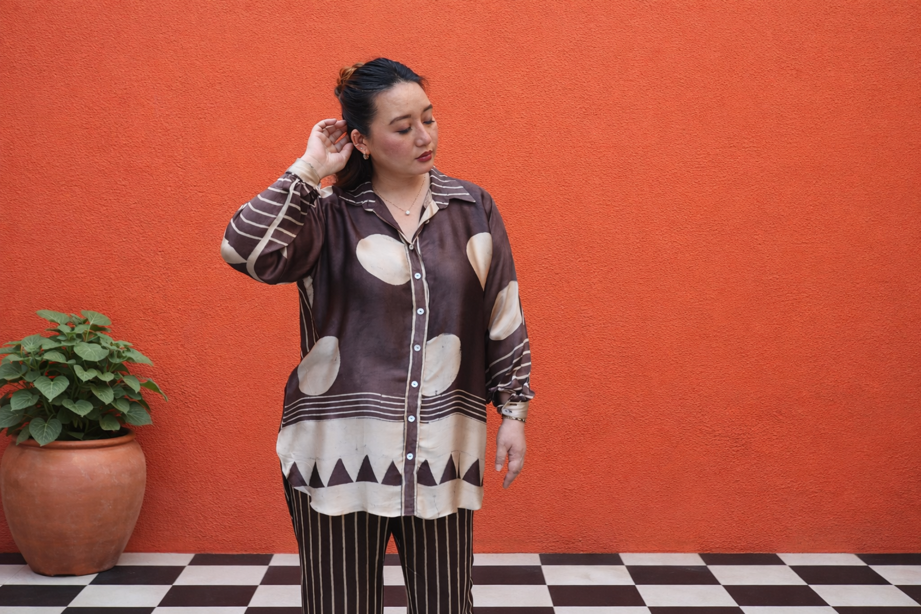 A fluid, free-flowing Hi Low top with statement sleeves, showcasing earthy brown and beige stripes accented with geometric circular motifs. Styled with relaxed, wide-legged pants for a contemporary silhouette and effortless comfort. Model height is 5'5" and is wearing a size L窶店L.