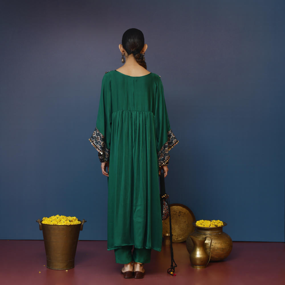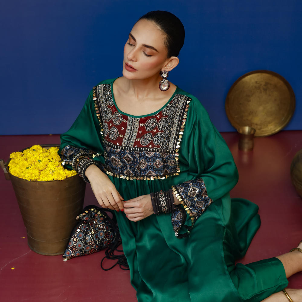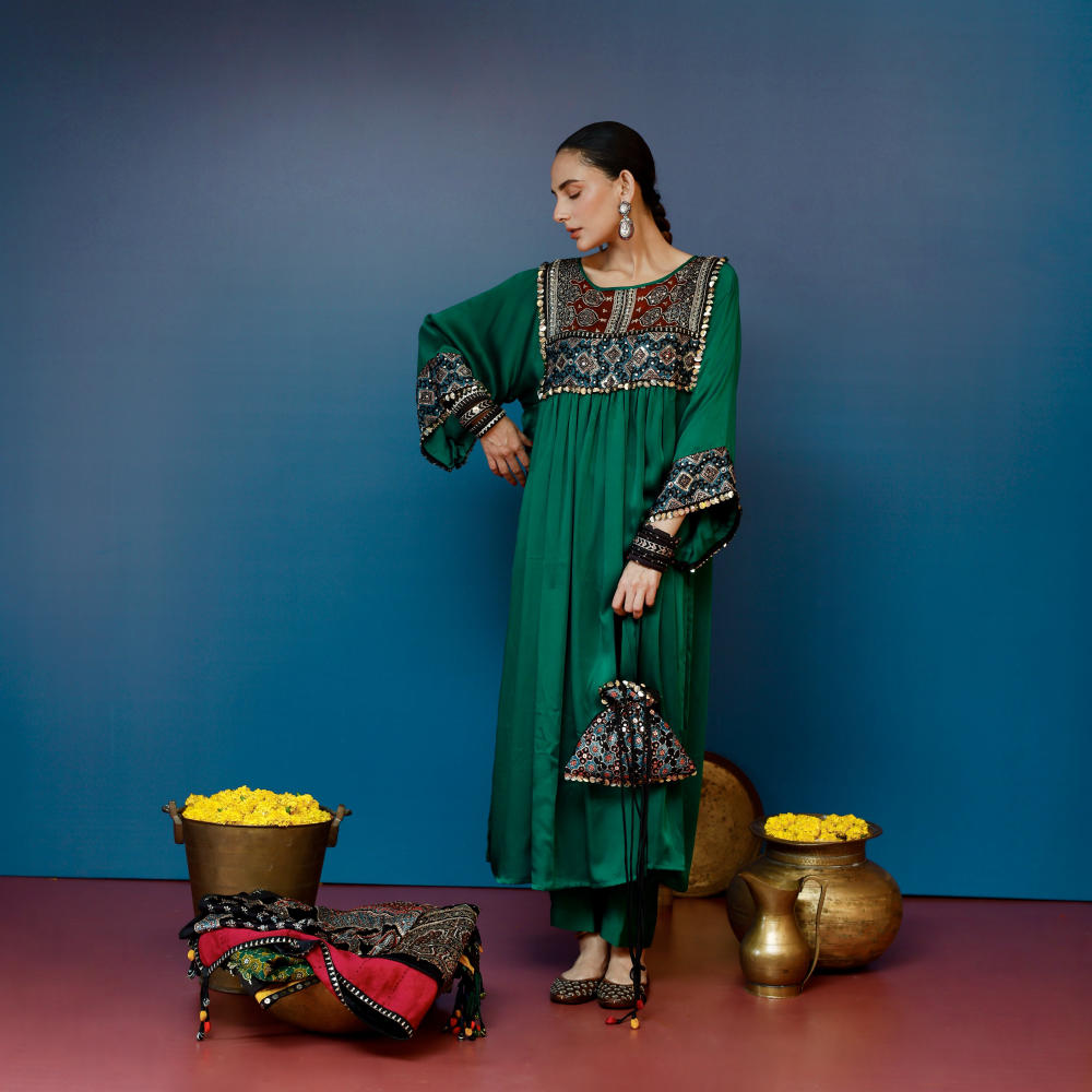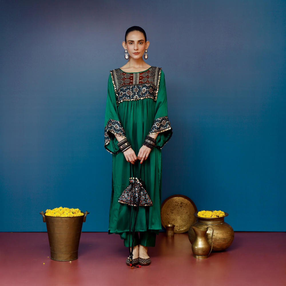 This green Balochi-inspired kurta set features intricate Ajrakh hand-embroidered applique on the yoke and sleeves, paired with matching pants for a refined look.