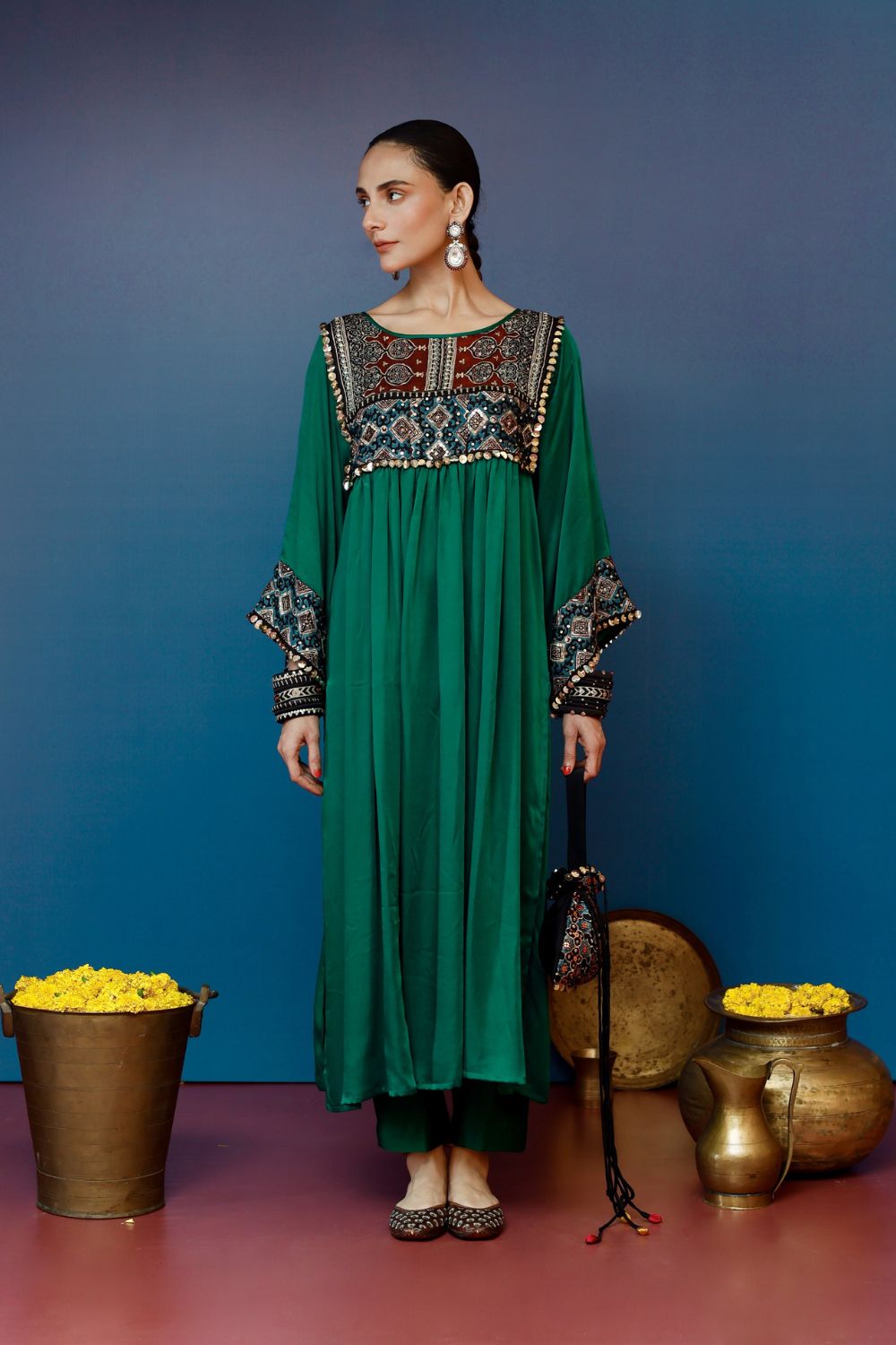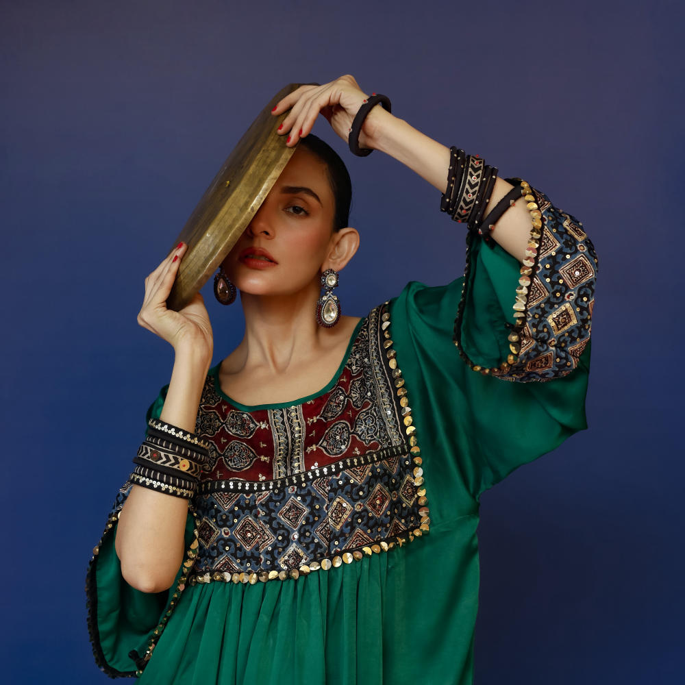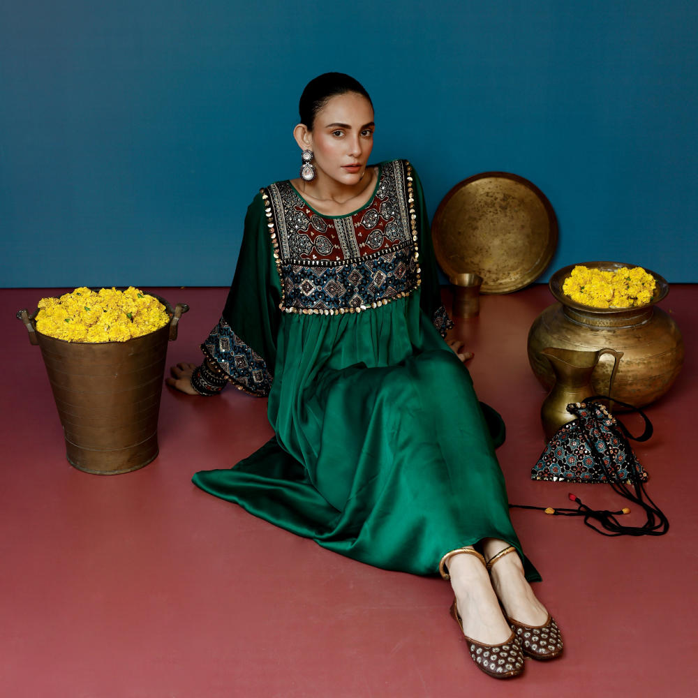 This green Balochi-inspired kurta set features intricate Ajrakh hand-embroidered applique on the yoke and sleeves, paired with matching pants for a refined look.