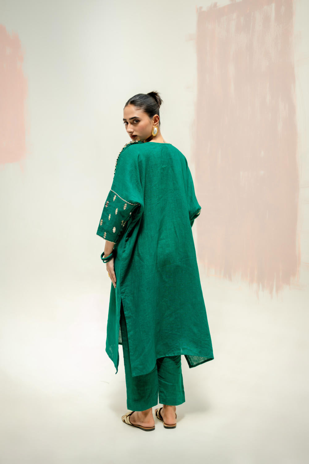 Made from 100% linen, this green-colour anti-fit kurta set combines style and comfort. Featuring hand-embroidered cuffs, slim linen pants, and functional pockets, it offers elegance and practicality in one.