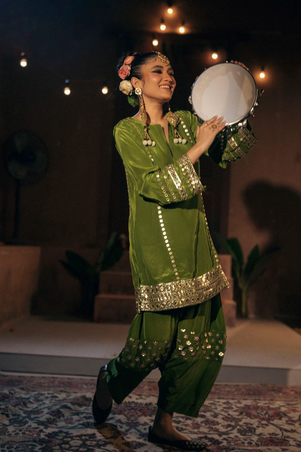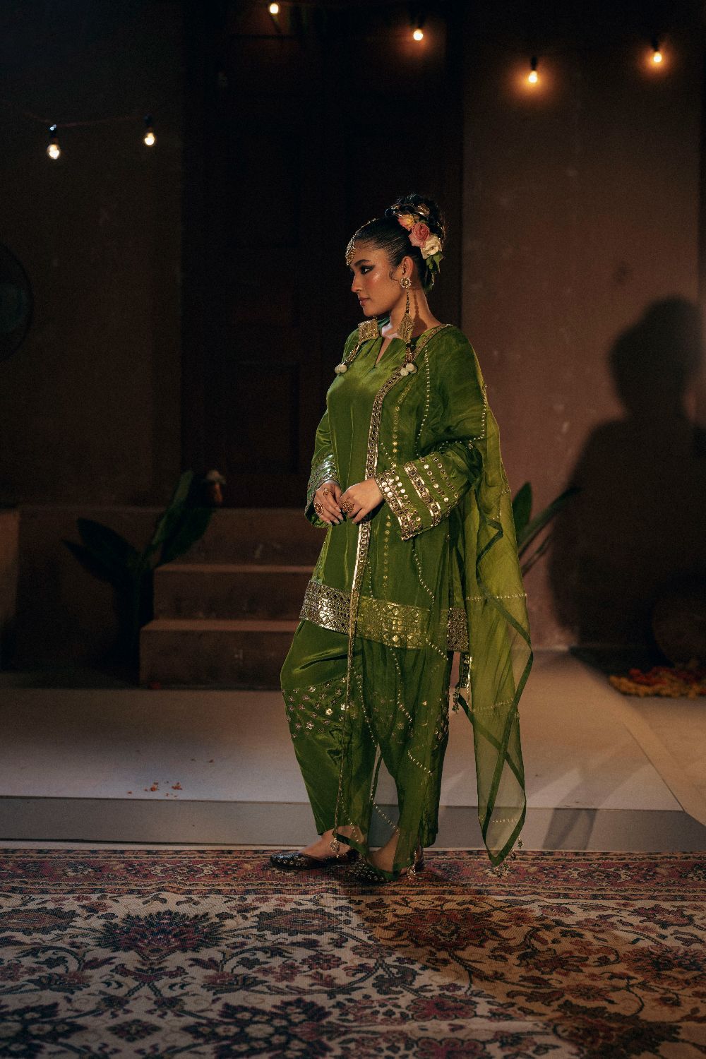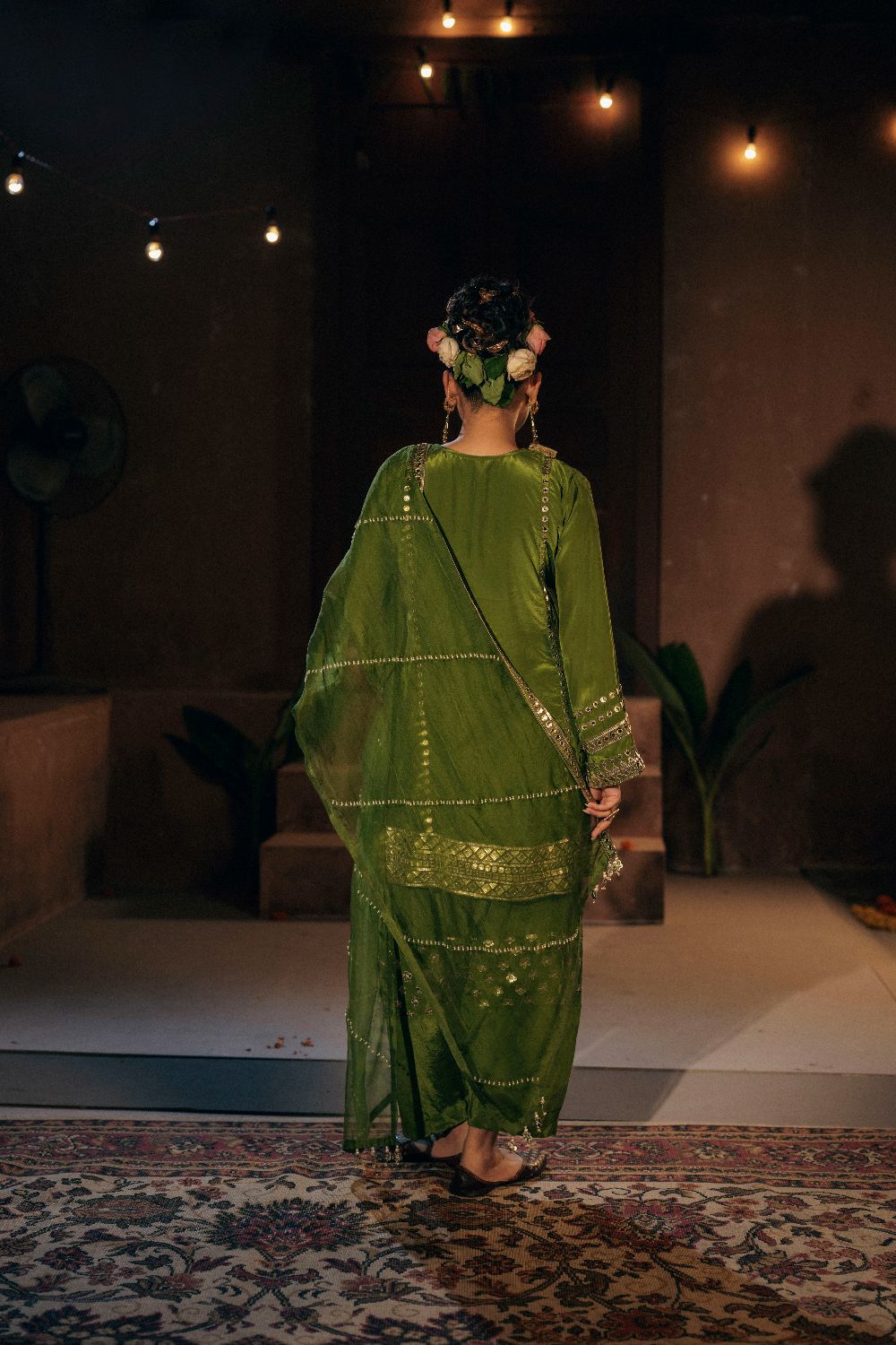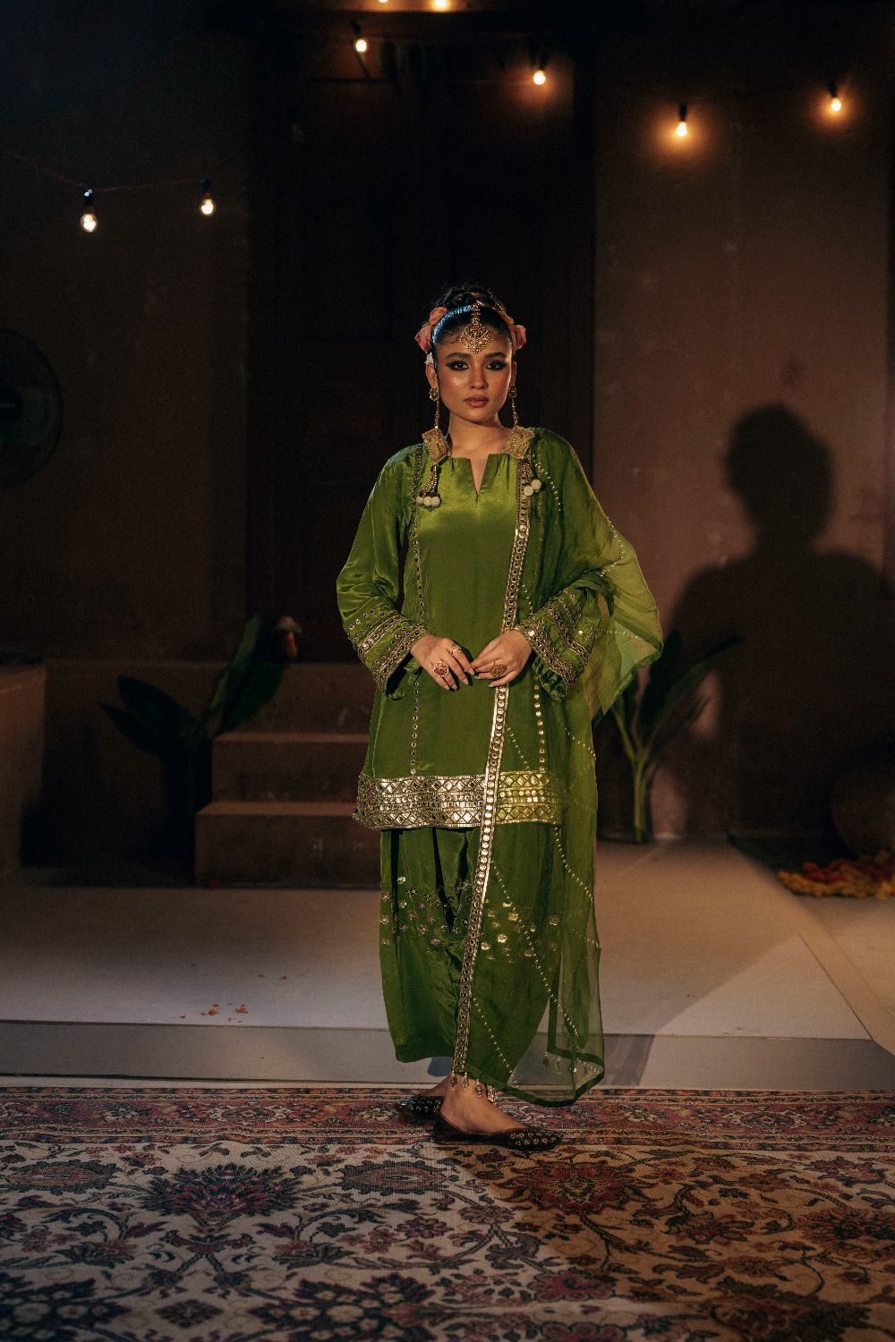 Salwar Kameez Kurta set featuring vegan leather appliqué in a light gold, gota-inspired design. The relaxed-fit kurta is paired with a coordinating salwar and a delicate dupatta, adding layers of elegance and drape. Perfect for pre-weddings, trousseau, festive occasions, and wedding celebrations. Model wears size S