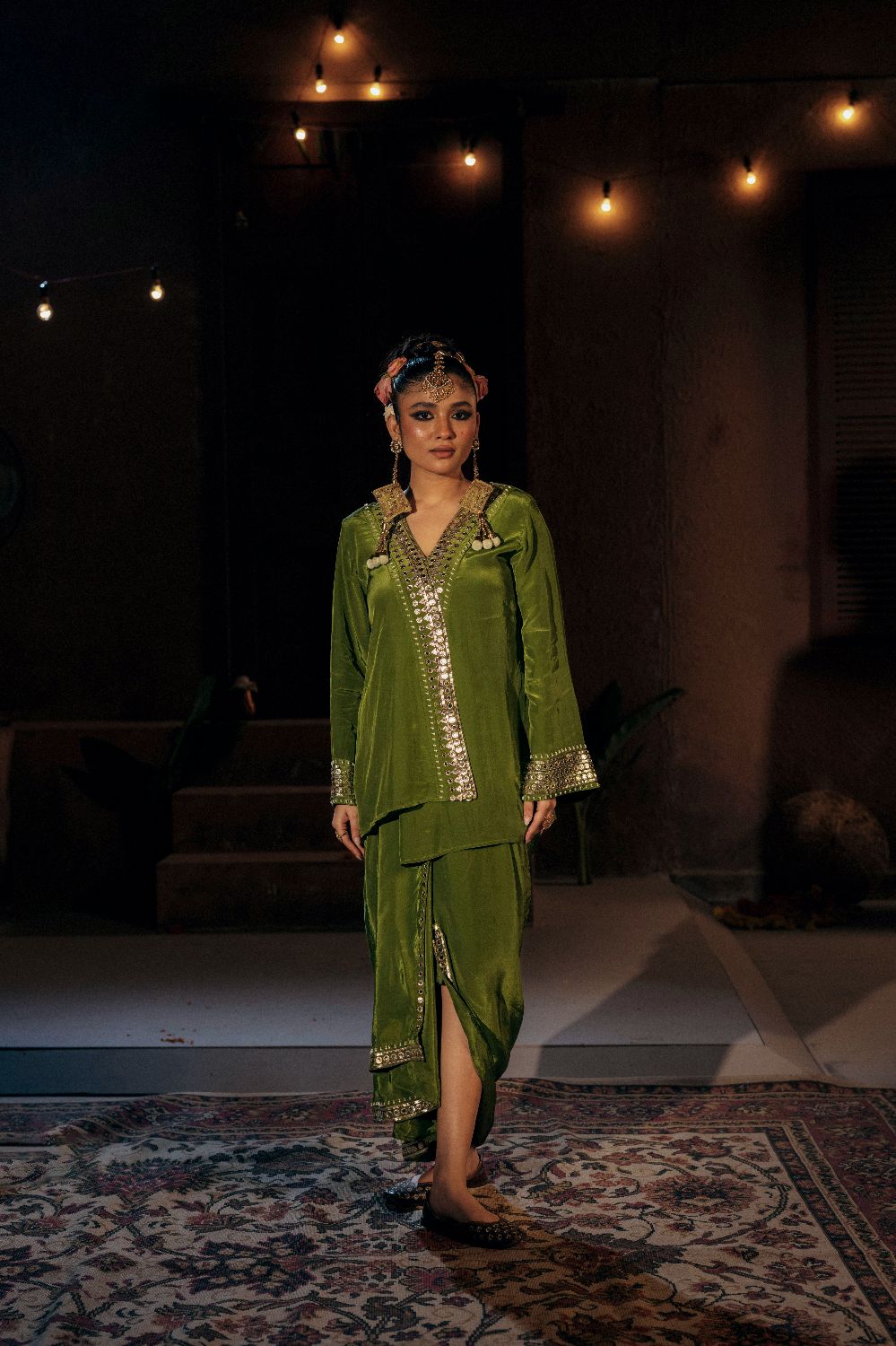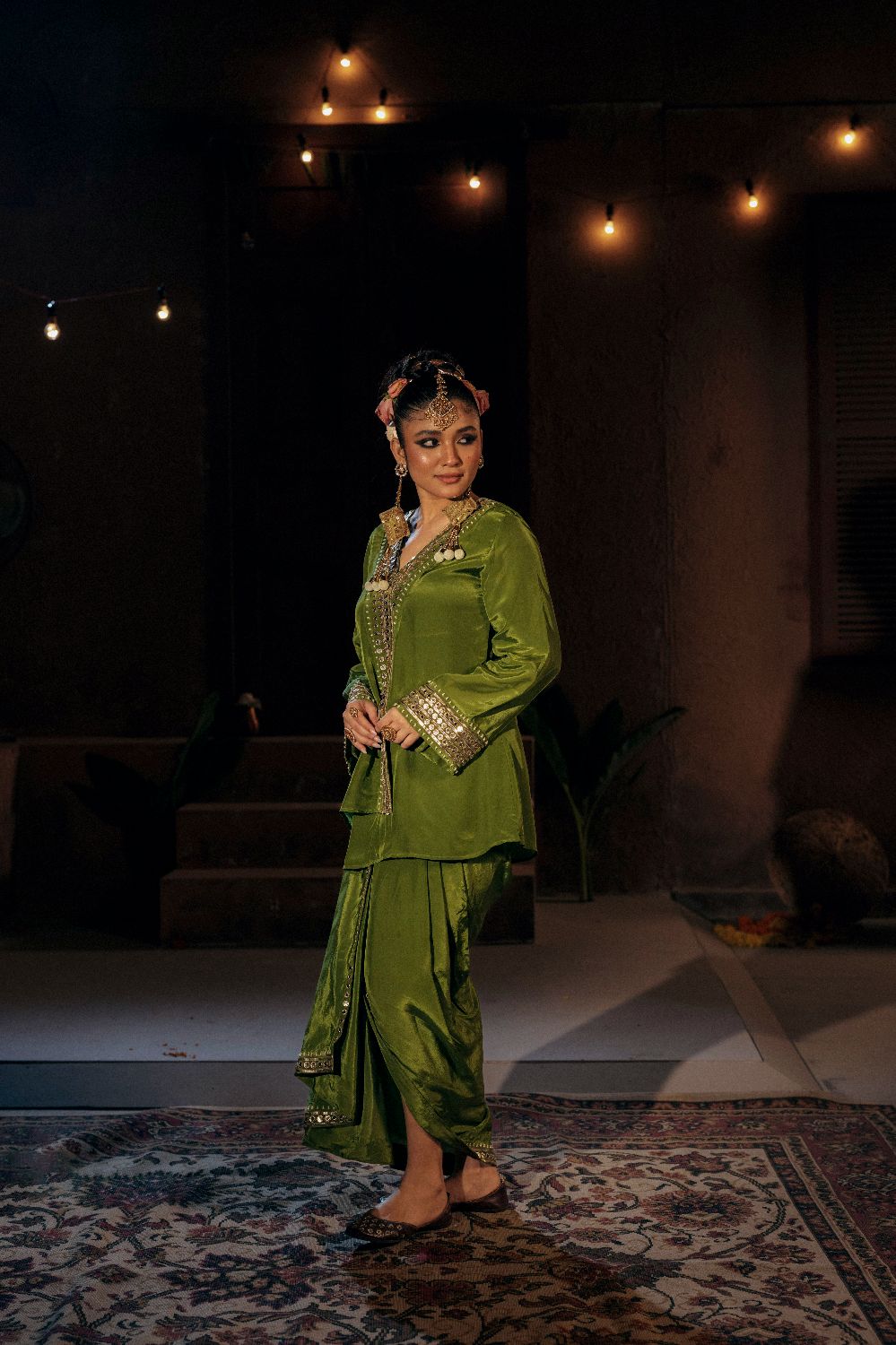 Turn heads in this structured jacket-style tunic paired with a flowing pleated skirt. Designed for comfort and modern elegance, this contemporary ensemble is perfect for pre-wedding events, festive occasions, and parties. Model wears size S