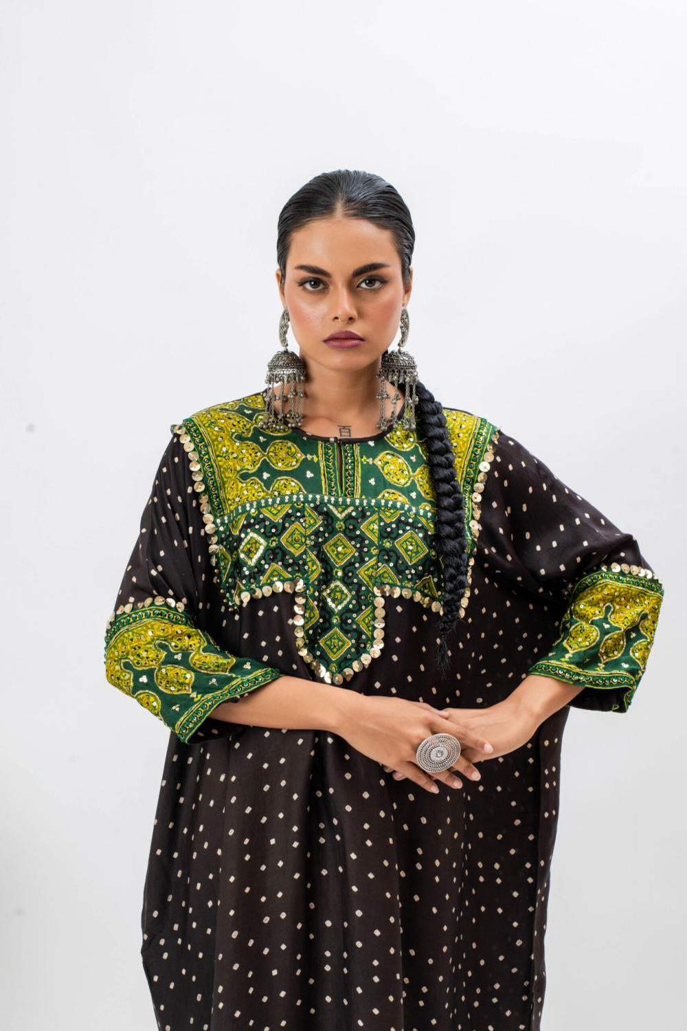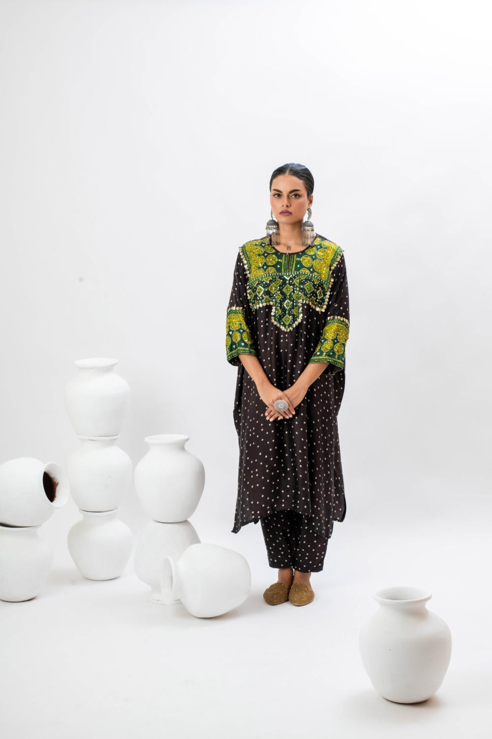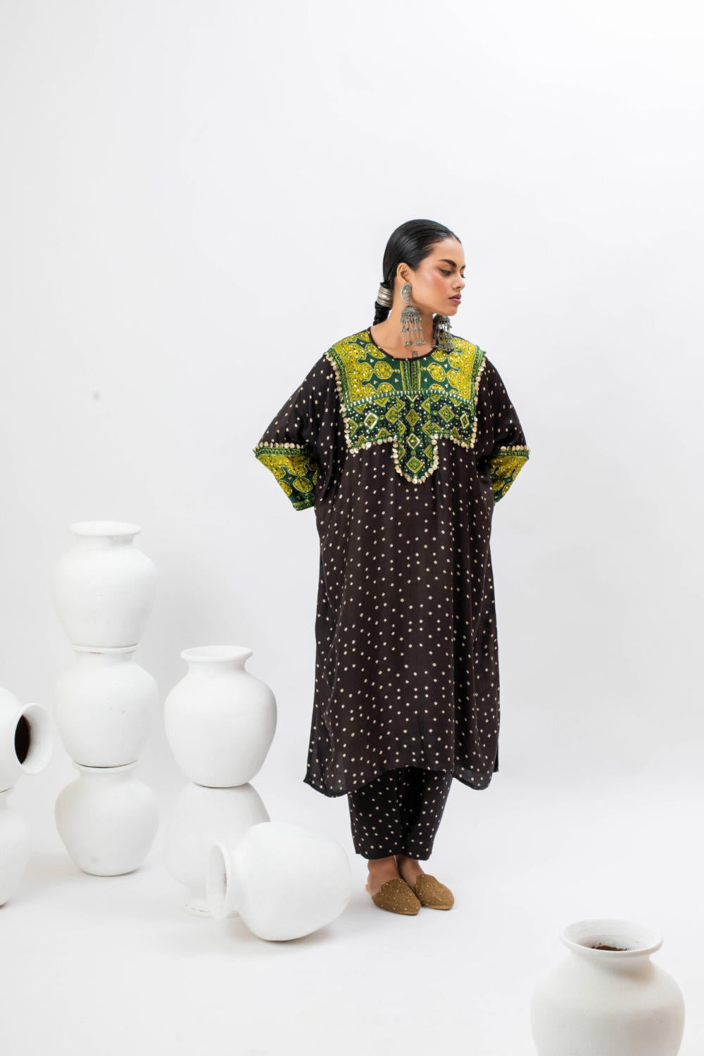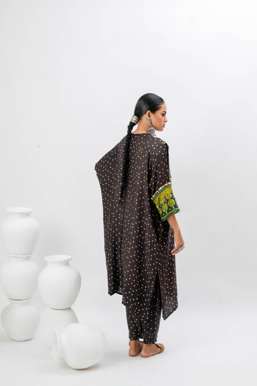 Black Ajrak hand embroidered anti-fit kurta with bat sleeves.The set comes with slim pants