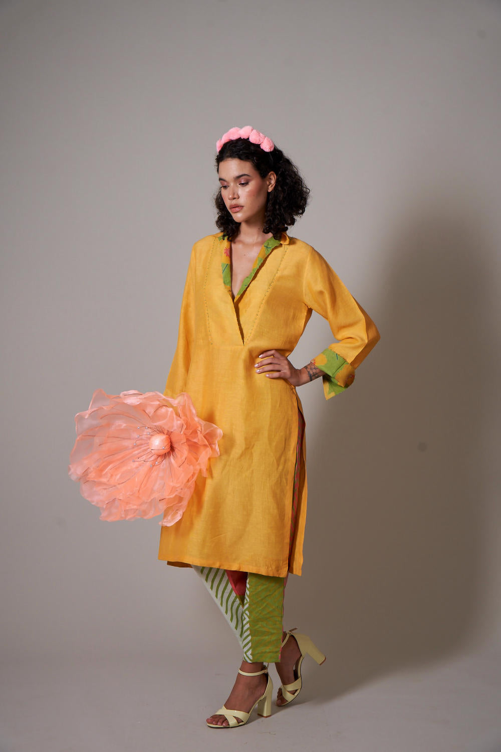 Sunshine yellow linen tunic and printed poppy peek-a-boo collar with beads detailing and geometric print pant.