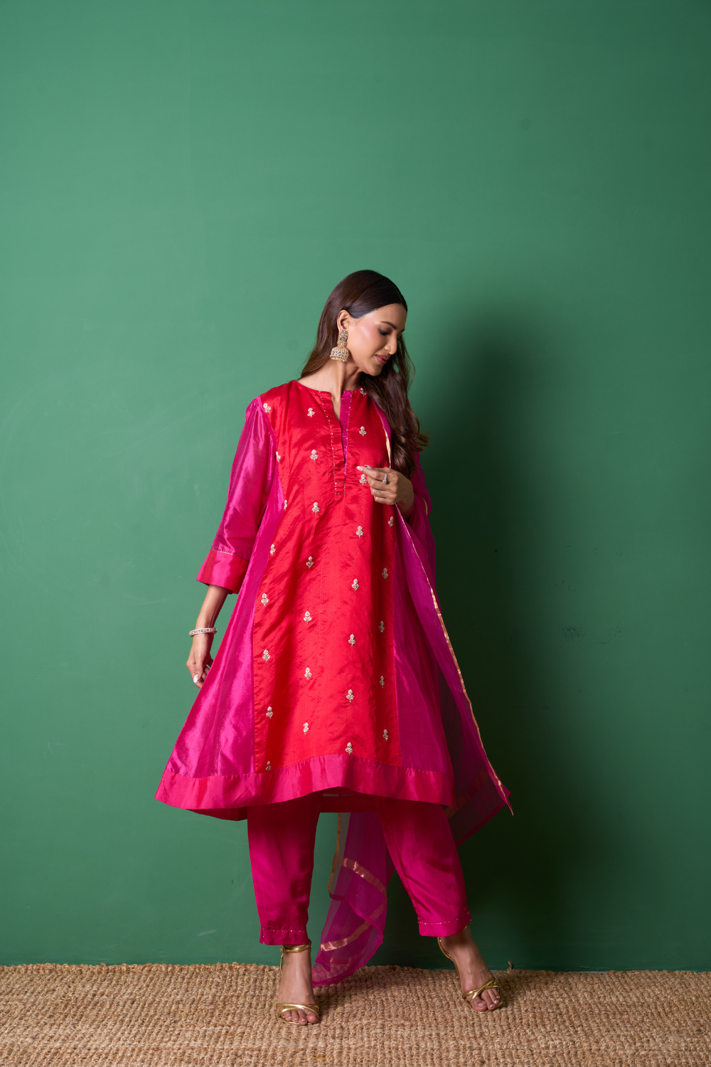 Relaxed fit kurta pants set with intricate zardozi details, and play of PinkRed panels with embroidered pants. Organza dupatta with golden border.