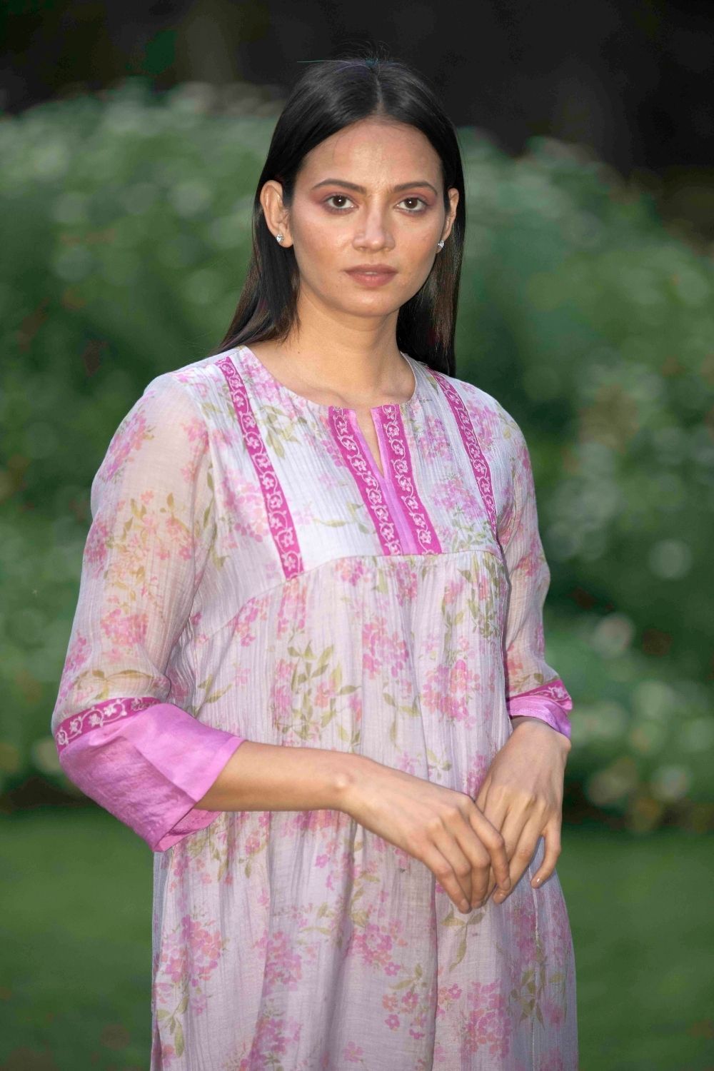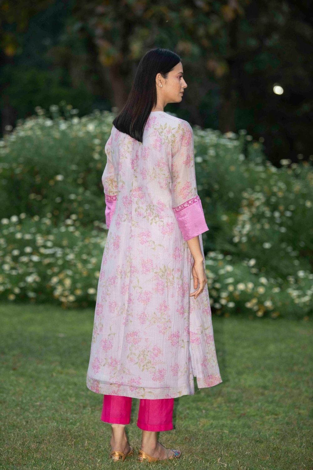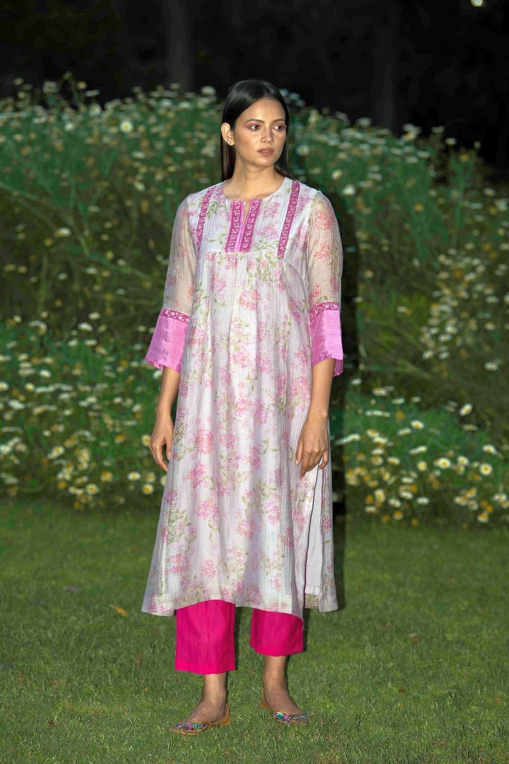 Signature floral print flowy kurta with pretty thread embroidery with textured pants