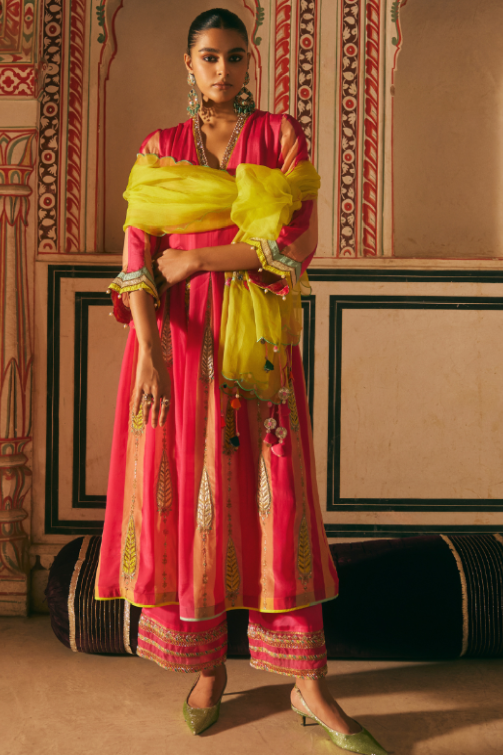 Embrace the charm of our captivating Pink Pintuck Crepe Kurta Set, featuring intricate embroidery A-line kurta mesmerizing allure complemented by an embroidered crepe palazzo. The contrast of a bright lime organza dupatta adds a pop of color, perfect for making a statement at any event.