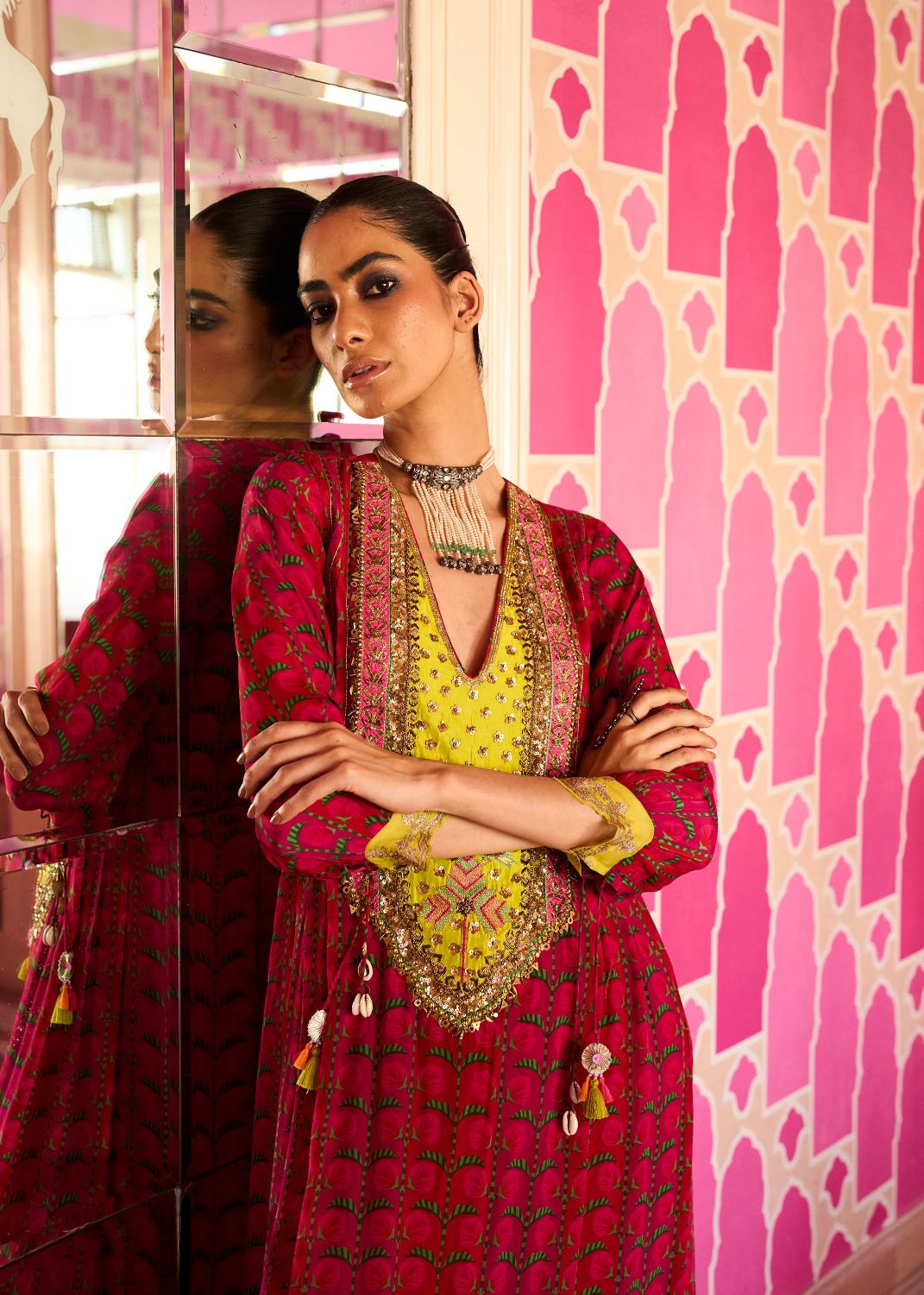 Their work is an ode to handcrafted Indian design — rooted in traditional embroidery techniques like zardozi, dabkaa, and fine threadwork, yet shaped into silhouettes that feel refreshingly contemporary. Clean cuts, relaxed forms, pure fabrics, and a distinctive palette come together to create pieces that travel seamlessly from India to Singapore and beyond.