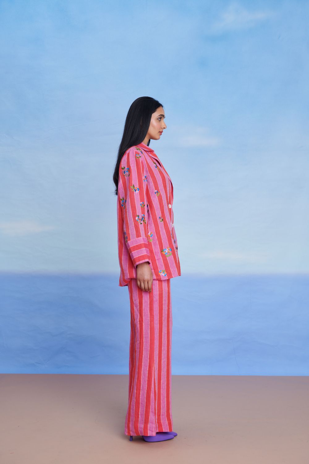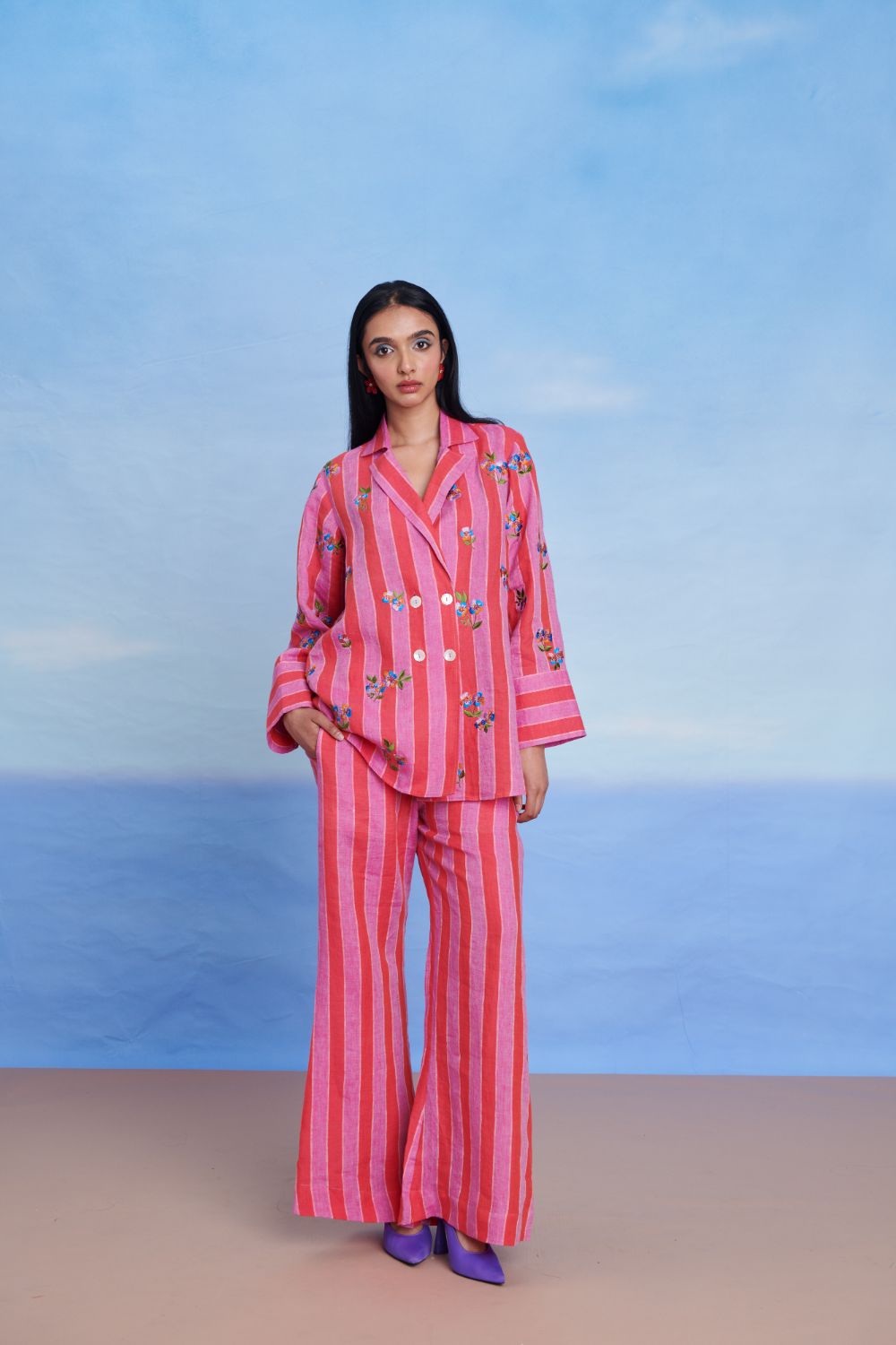 A bold yet breathable set that reimagines summer tailoring. The double-breasted blazer shirt is crafted from 100% pure linen with striking stripes and delicate floral embroidery — finished with a notched lapel, side pockets, and a relaxed fit. Paired with high-waisted bell-bottom pants featuring a wide-leg silhouette, side button closure, and an elasticated back, this set moves with ease while making a statement.