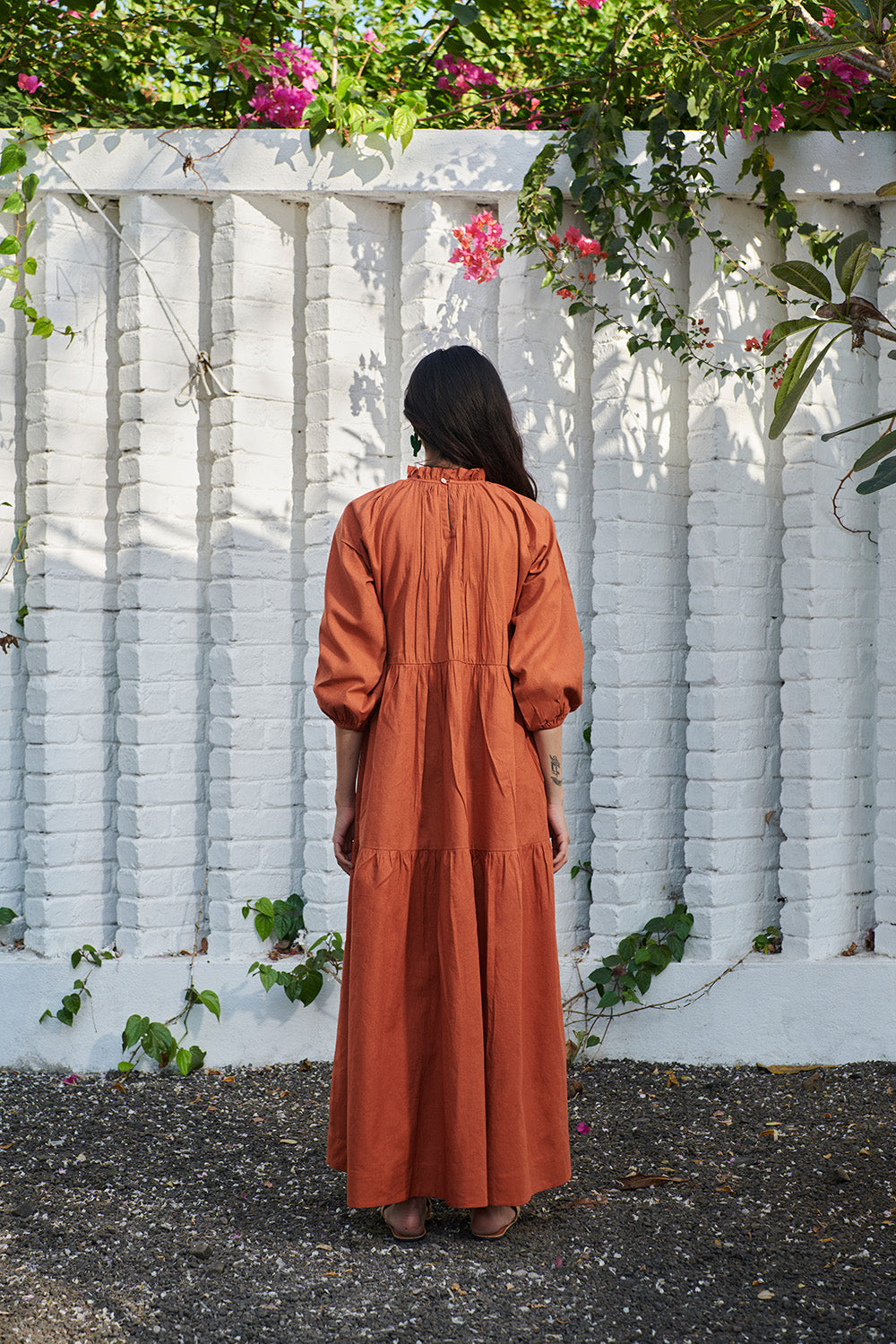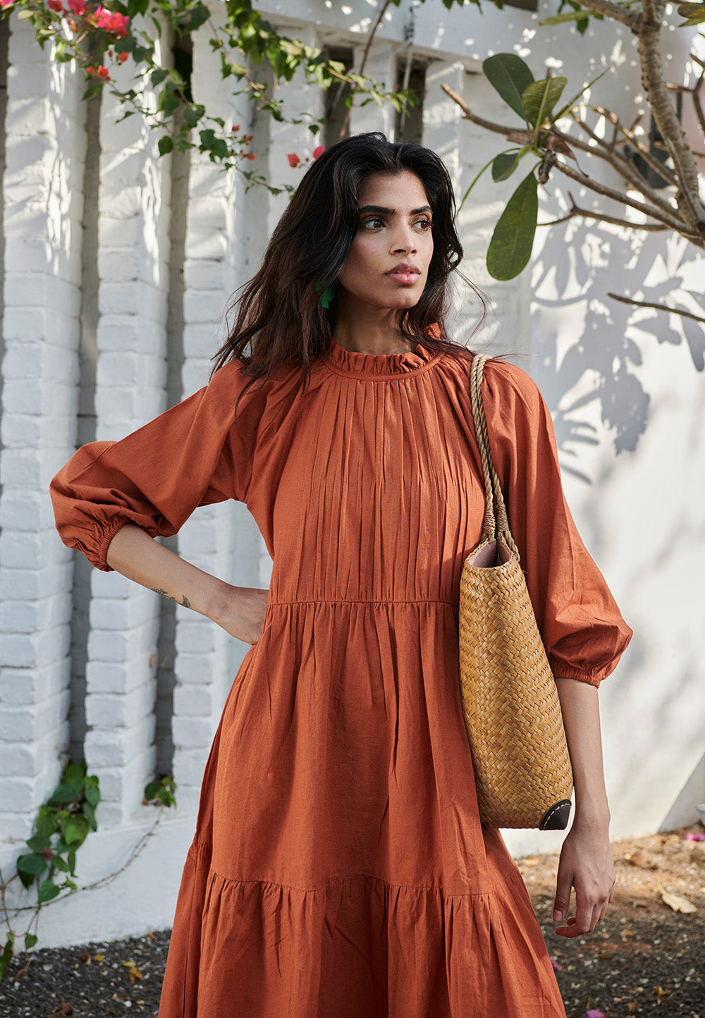 A billowy three-tiered dress with a gathered high neckline and voluminous sleeves for an effortlessly elegant silhouette. Designed with soft pleats and a relaxed fit, it flows with ease for all-day comfort.