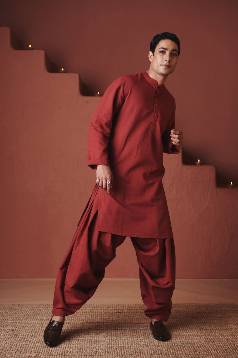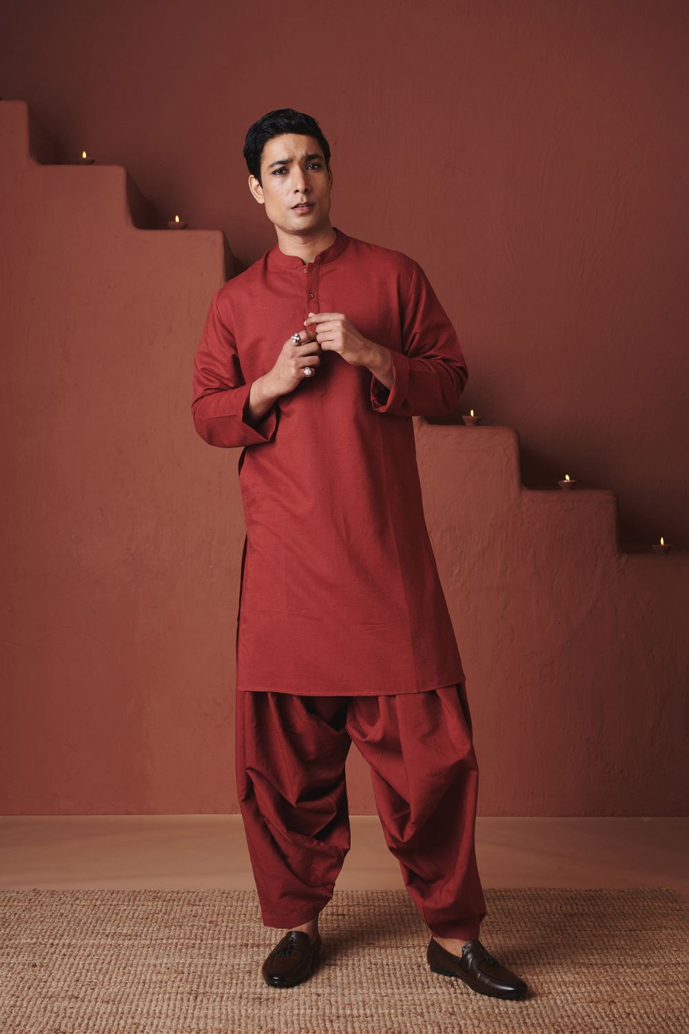 A classic kurta paired with voluminous dhoti-style bottoms, designed for fluid movement and a traditional yet contemporary edge. The kurta features a clean band collar with a buttoned placket, while the dhoti pants add draped texture and festive flair. A timeless silhouette reinterpreted for modern celebrations, balancing comfort with cultural richness.