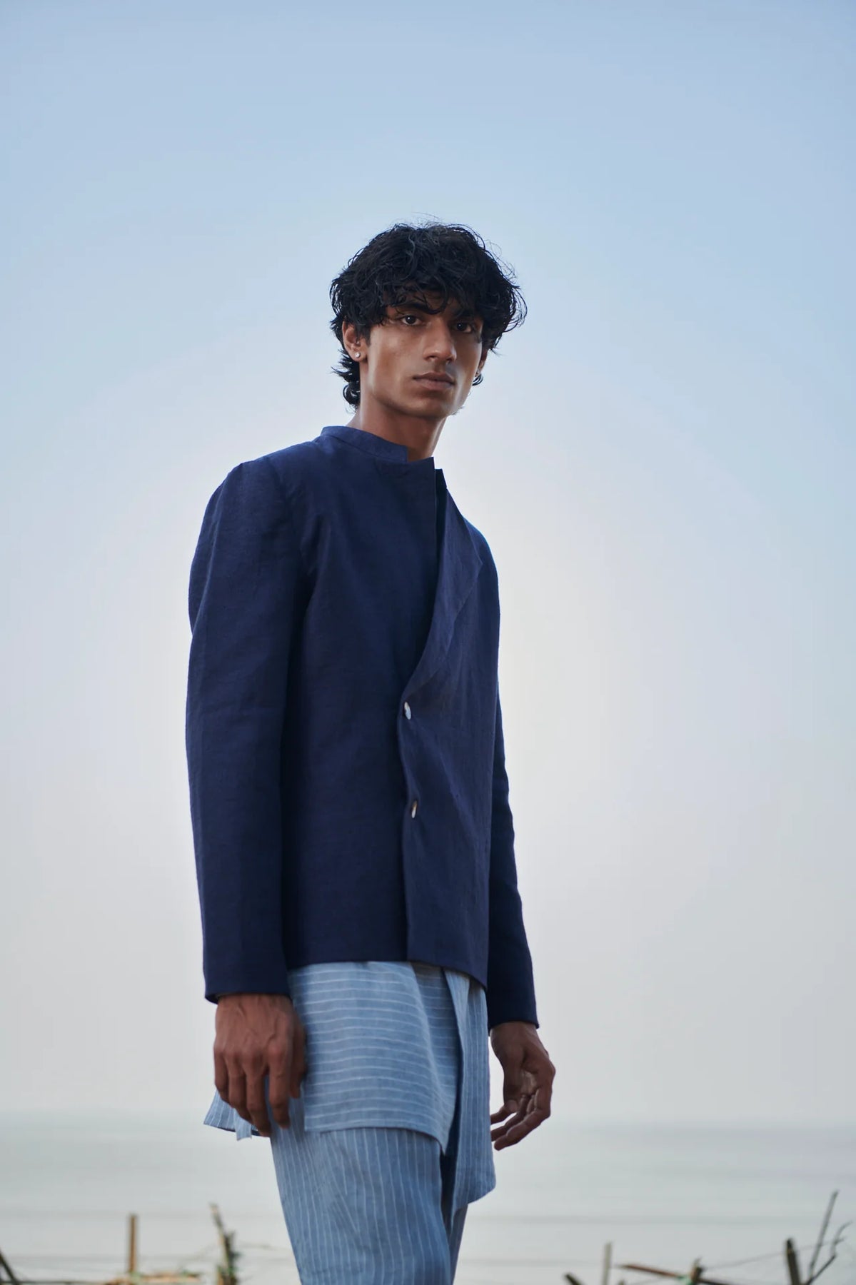 Tailored from 100% pure linen in a richly textured weave, this bandhgala jacket offers quiet authority. The fabric has weight and presence — structured enough to hold form, yet breathable enough to wear across seasons. Featuring a soft stand collar, asymmetric double-breasted front, and sharp shoulders, it’s cut to sit cleanly at the waist for ease of layering. Finished with mother-of-pearl buttons and minimalist inner seams, it brings together heritage tailoring and contemporary movement. This is linen with edge — ceremonial in spirit, everyday in intention.