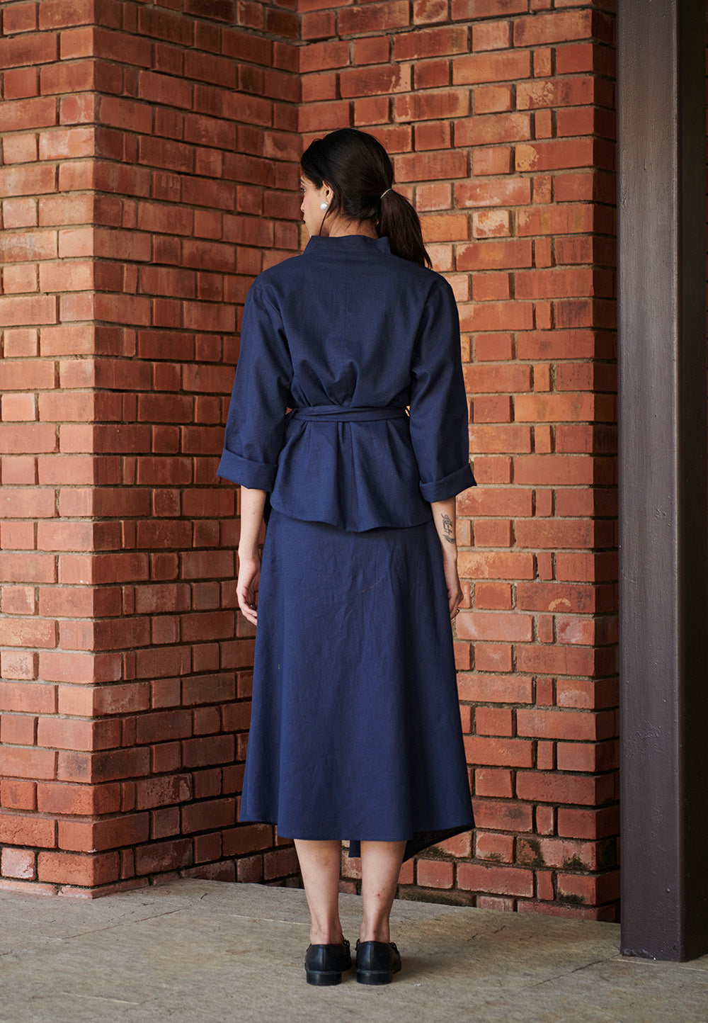 A refined co-ord set featuring a structured wrap jacket with an adjustable tie belt and an asymmetrical skirt for fluid movement. Designed with soft tailoring and layered details, it blends modern elegance with effortless ease.