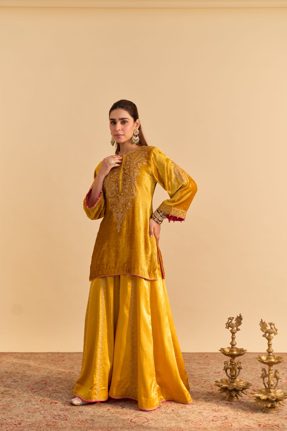 This short kurta from our Velvet Collection features a zero neck, a back zero neck, and three-quarter sleeves. It is paired with an embroidered sharara, adding a contemporary yet traditional touch to the ensemble. The kurta is adorned with intricate aari tilla embroidery, beautifully highlighted with pearls and sequins to enhance its richness and festive charm.