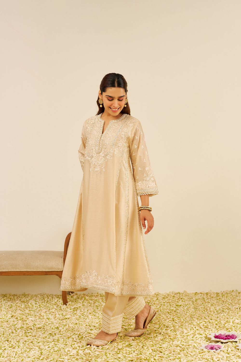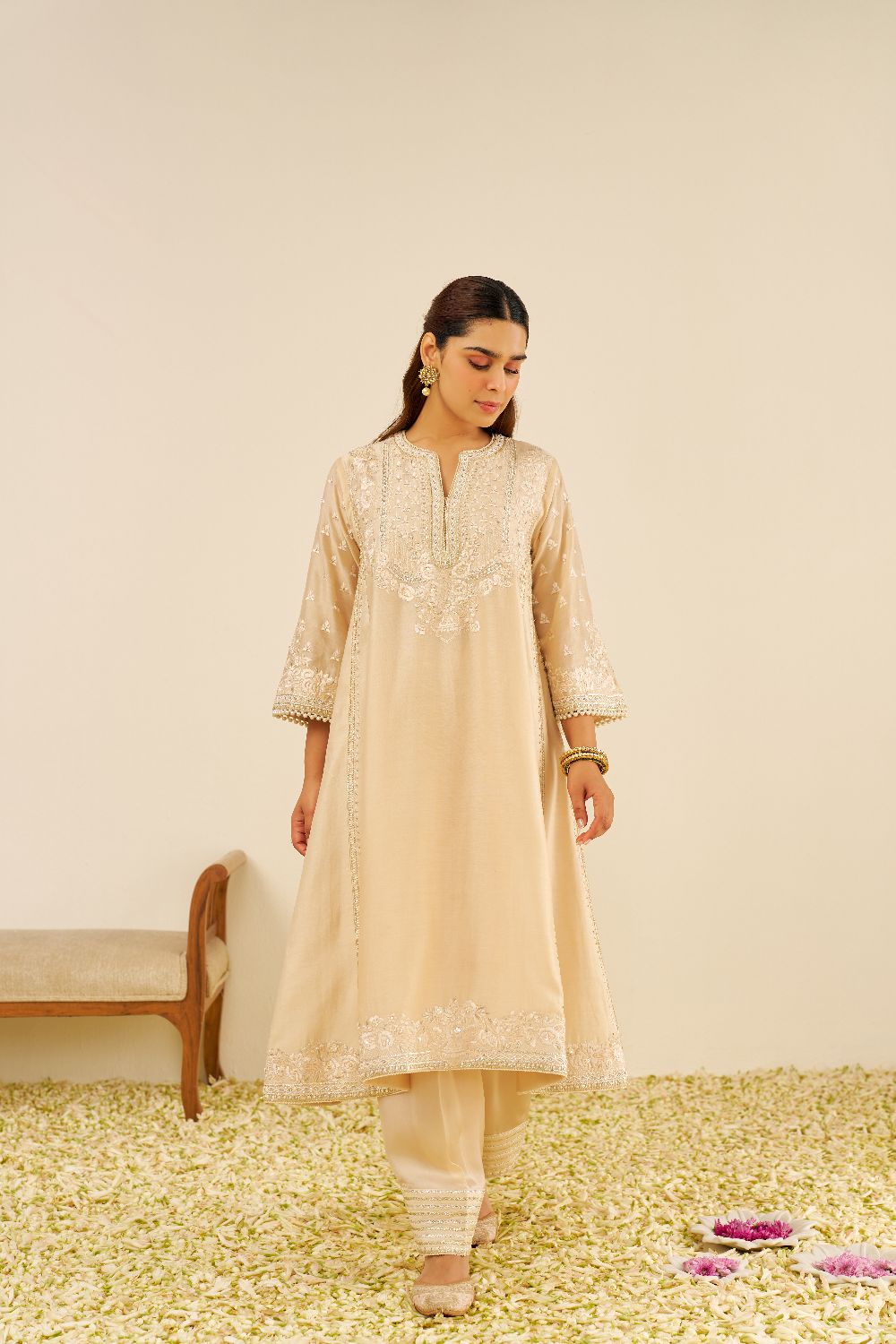 Each garment carries her signature balance — delicate motifs, fluid silhouettes, and a fit that feels custom even before tailoring begins. Her embroideries are intricate yet airy, expressive yet elegantly understated.