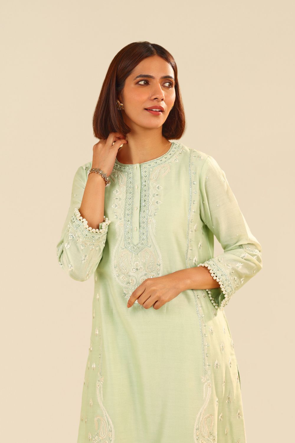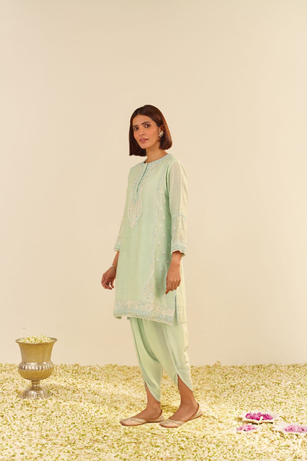 This exquisite ensemble is crafted from pure Silk Chanderi fabric, offering a luxurious and refined texture. It is elegantly adorned with heritage Parsi Gara embroidery, showcasing intricate craftsmanship that adds timeless beauty to the design. The outfit features a chic zero-neck with a placket and three-quarter sleeves, combining traditional elegance with contemporary flair.