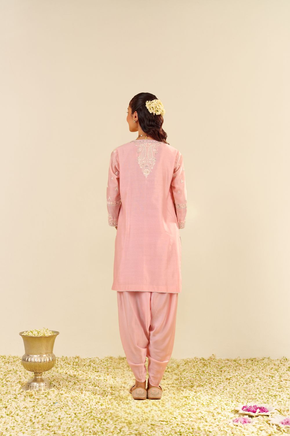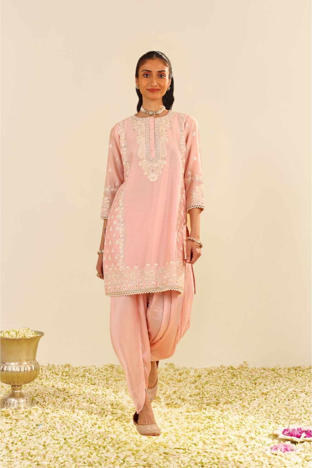 Each garment carries her signature balance — delicate motifs, fluid silhouettes, and a fit that feels custom even before tailoring begins. Her embroideries are intricate yet airy, expressive yet elegantly understated.