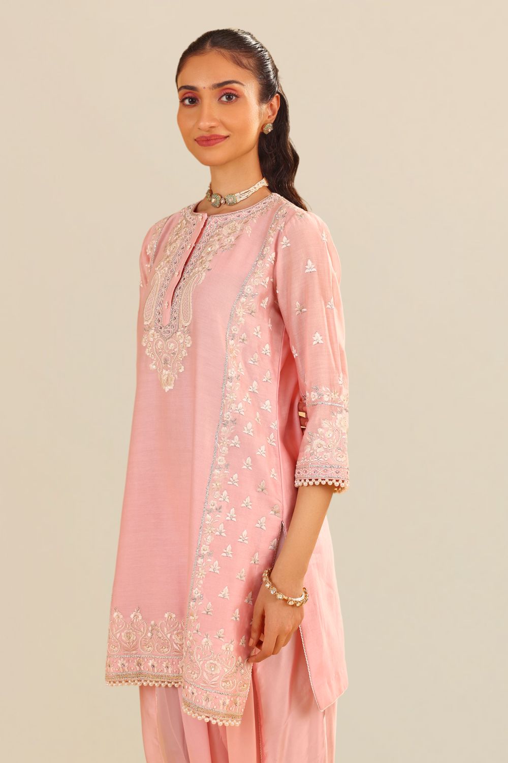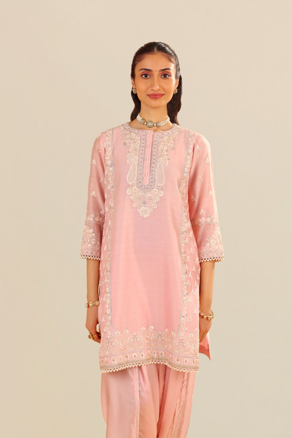 This exquisite ensemble is crafted from pure Silk Chanderi fabric, offering a luxurious and refined texture. It is elegantly adorned with heritage Parsi Gara embroidery, showcasing intricate craftsmanship that adds timeless beauty to the design. The outfit features a chic zero-neck with a placket and three-quarter sleeves, combining traditional elegance with contemporary flair.
