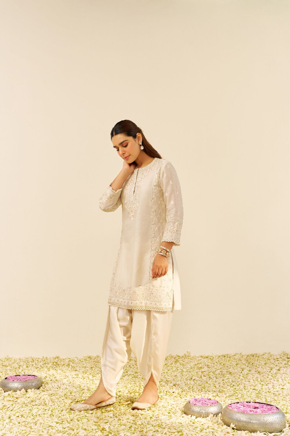 Paired with a stylish tulip dhoti, the ensemble radiates a unique sense of grace and sophistication. The entire creation is beautifully highlighted with delicate Tilla, Gota, and pearls, which enhance the intricate embroidery and elevate the overall look. Finished with the finest Chanderi silk fabric, this ensemble is a perfect fusion of heritage, craftsmanship, and modern style.