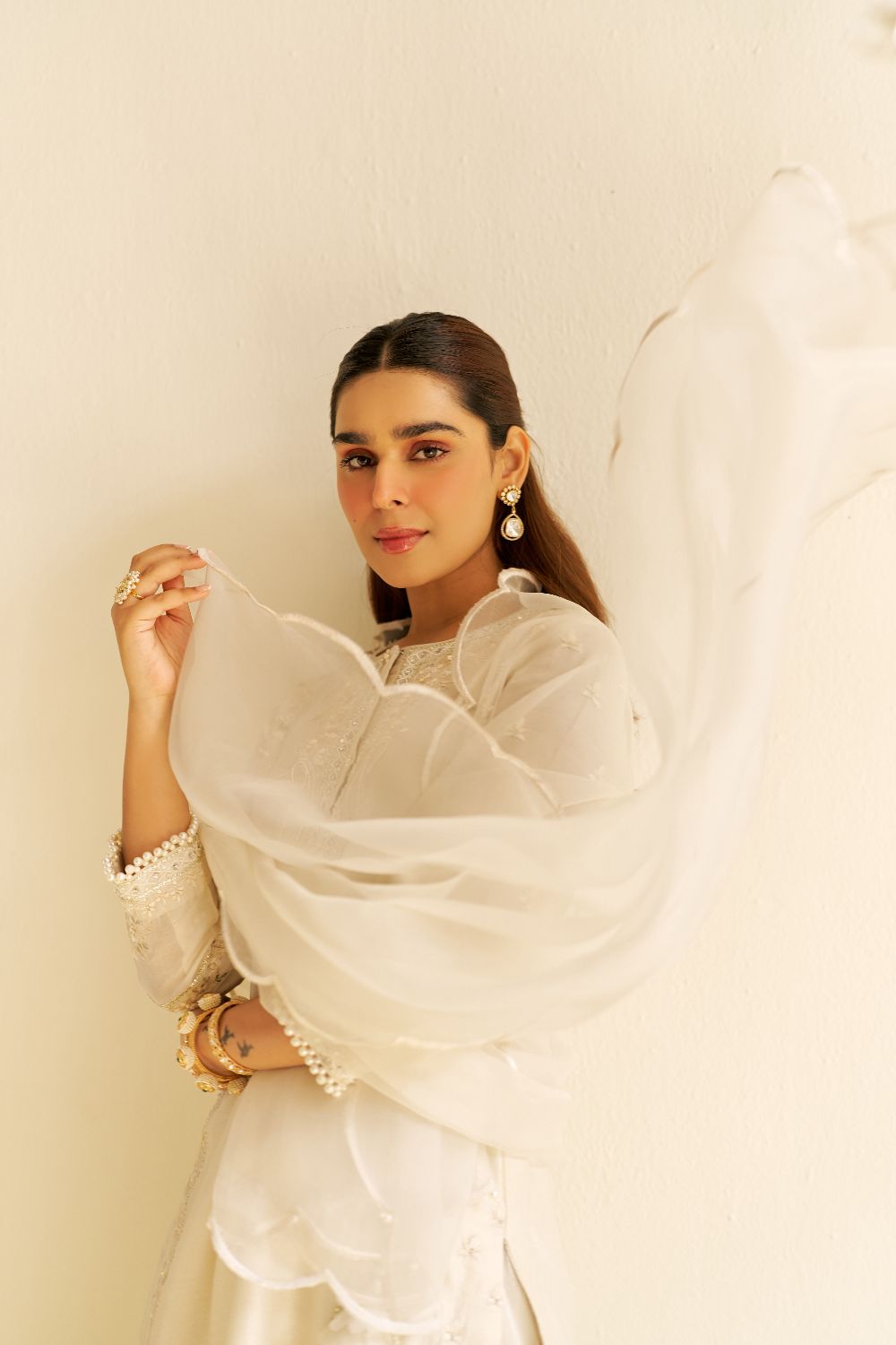Each garment carries her signature balance — delicate motifs, fluid silhouettes, and a fit that feels custom even before tailoring begins. Her embroideries are intricate yet airy, expressive yet elegantly understated.