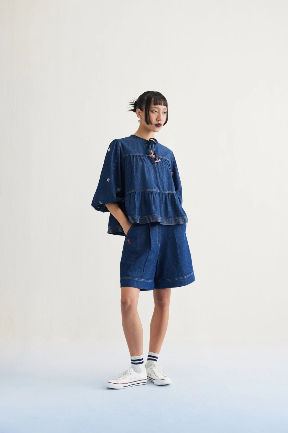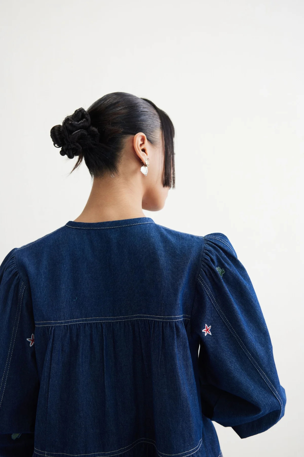 Regular fit, three quarter puff sleeve, gathered and tiered shirt with a keyhole neckline that fastens with fabric ties, crafted in indigo dyed cotton denim fabric created with a blend of cotton and recycled cotton fibres, machine and hand embroidered with ocean-inspired motifs.