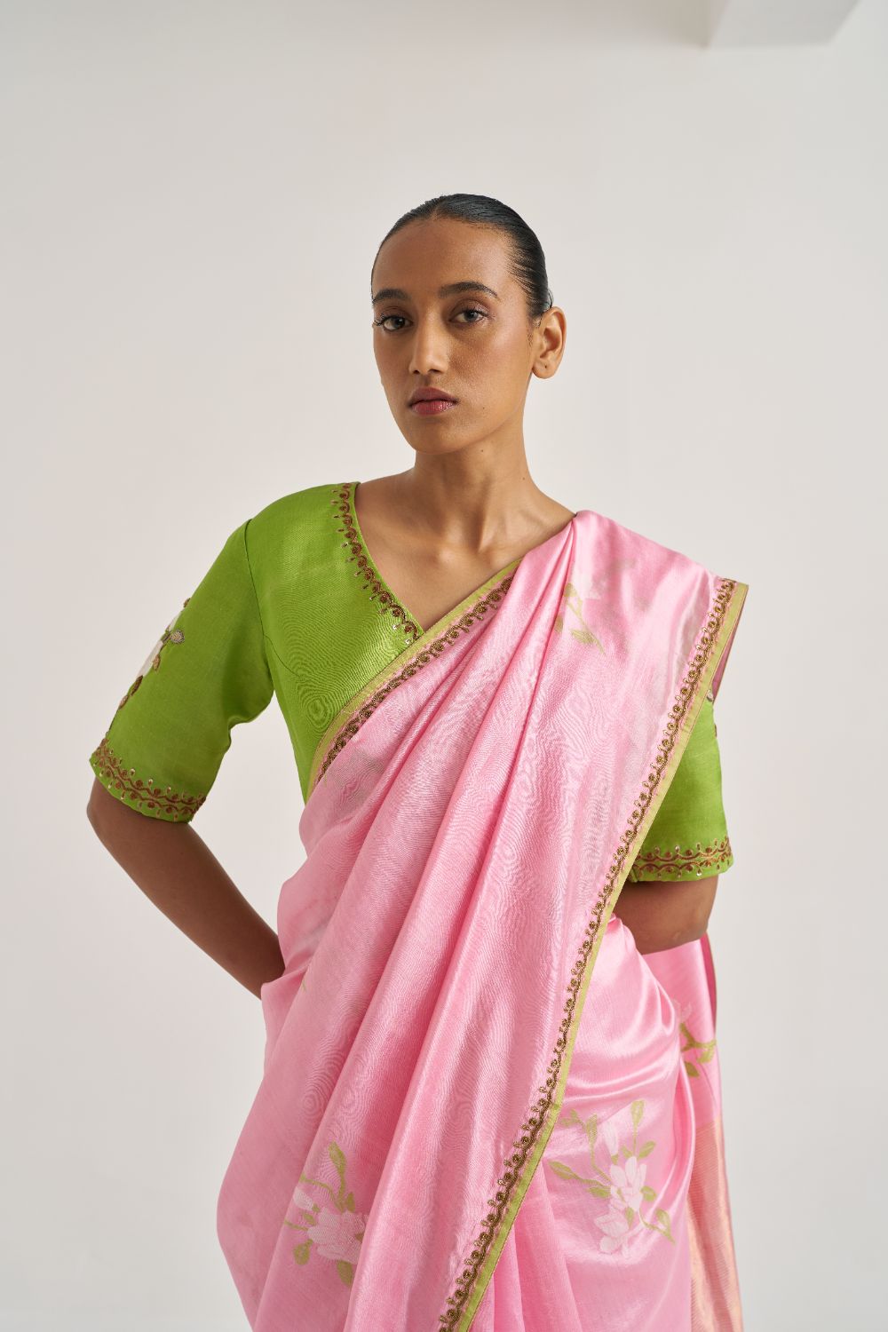 A Light Pink Handwoven Mulberry Silk Sari Detailed With White Floral Bunch Jamdani Motifs, A Striped Zai Pallu, An Ari Hand Embroidered Border Along A Green Selvedge.