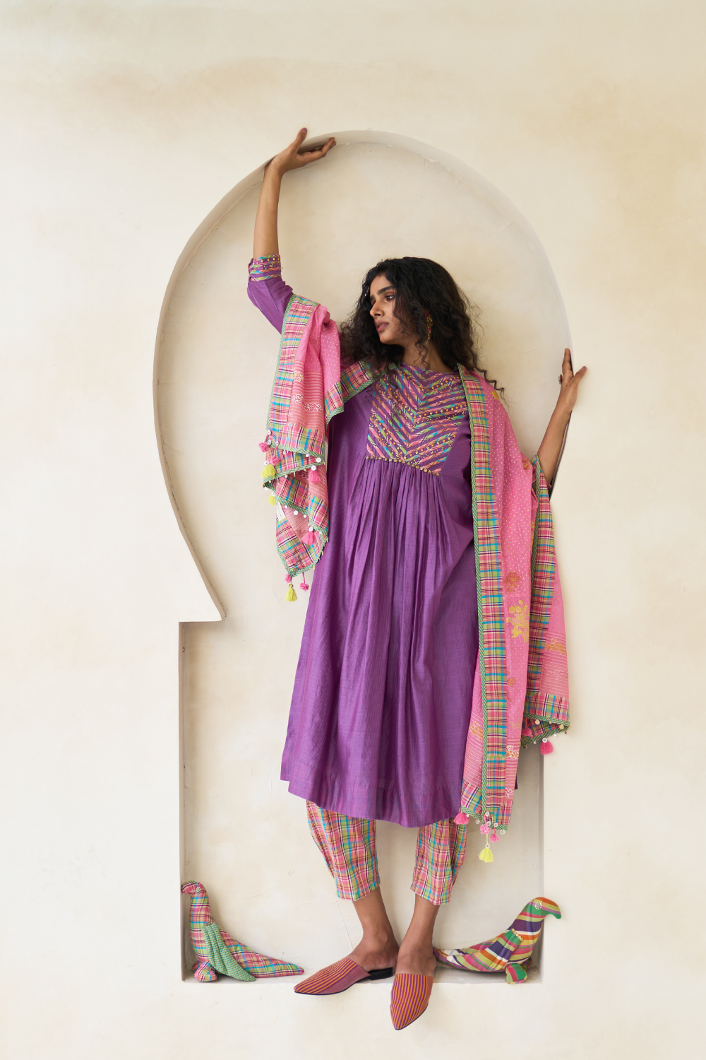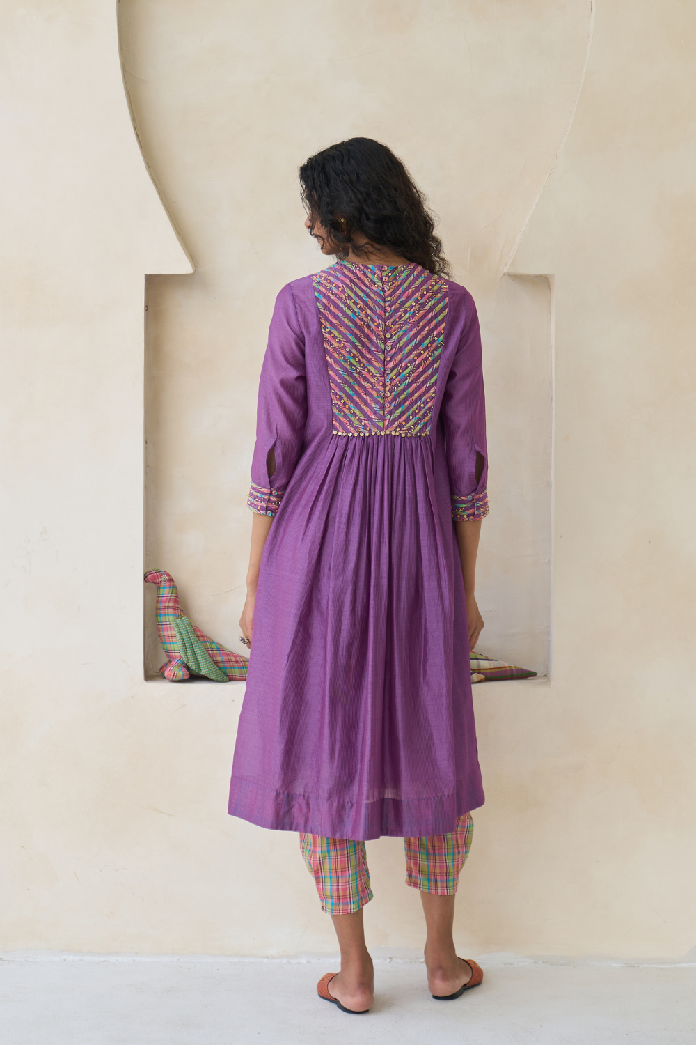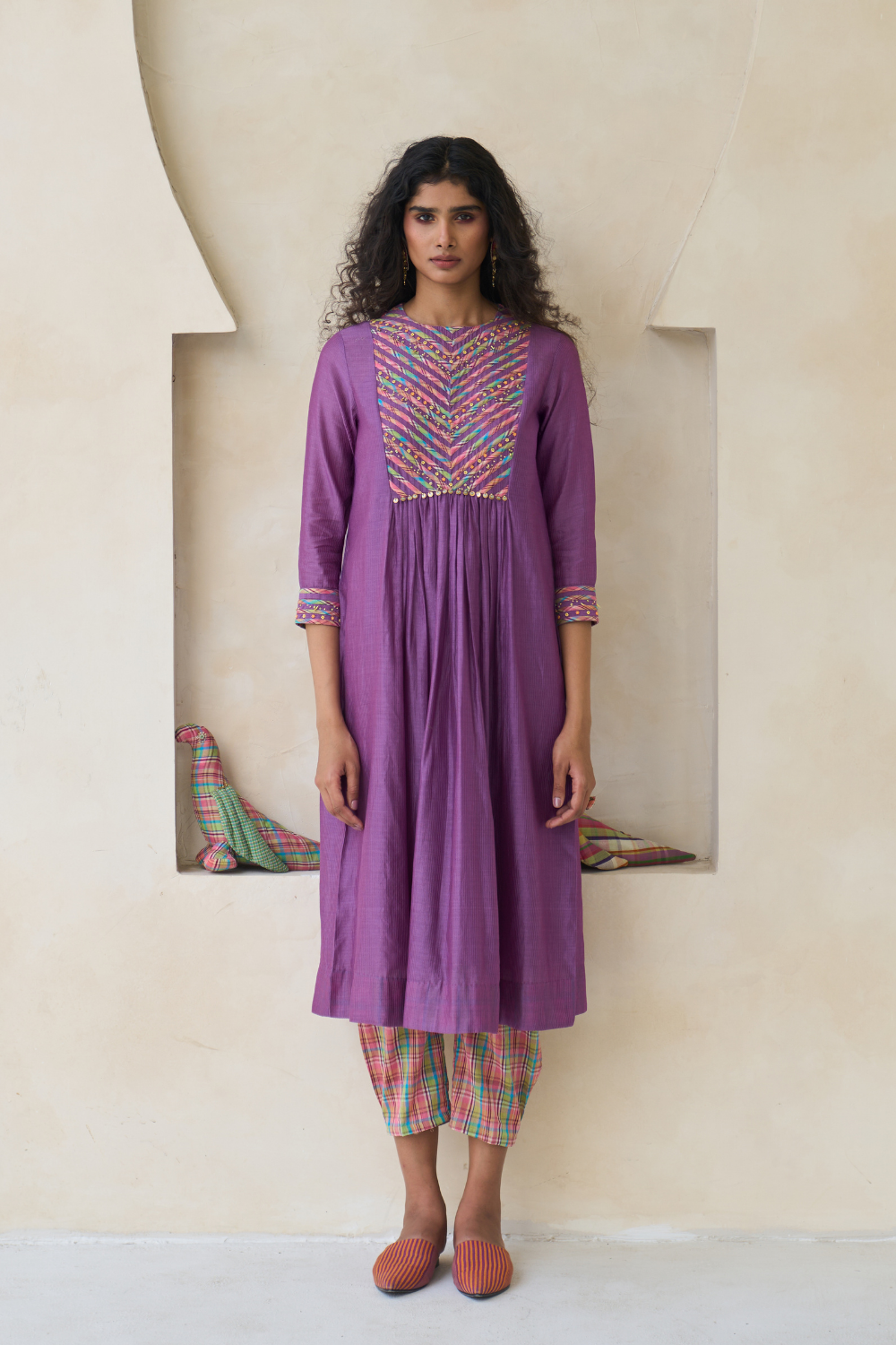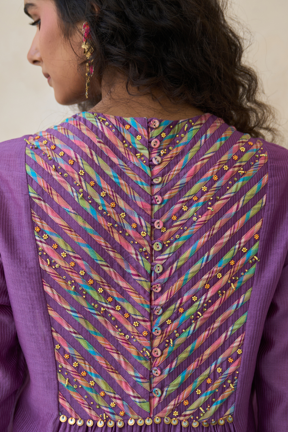 Kurta in striped self Chanderi with multicolour handwoven piping on the yoke and cuffs, featuring hand embroidery, front and back gathers, and beadwork fringing. Comes with a 100% cotton slip.